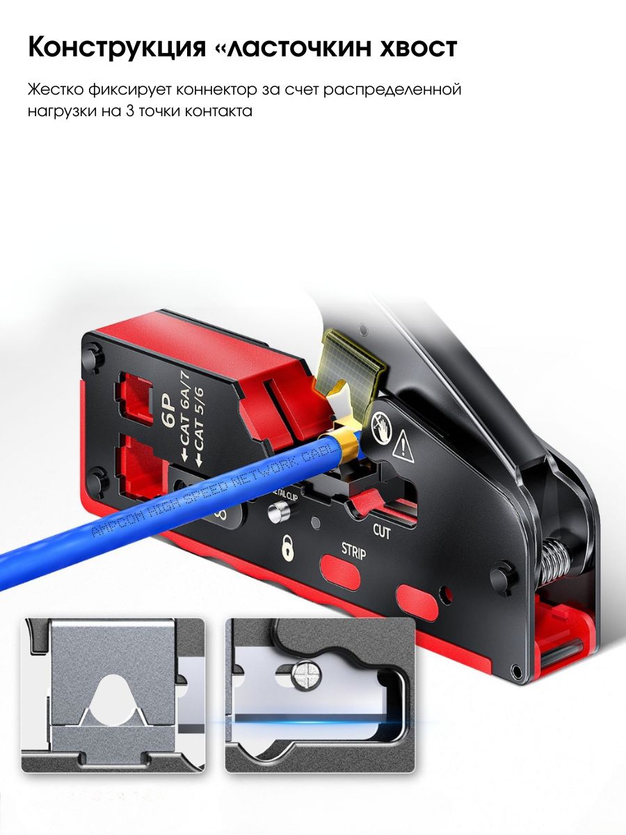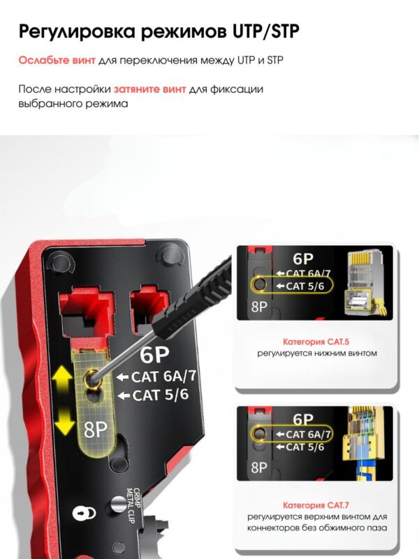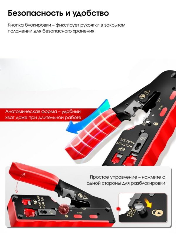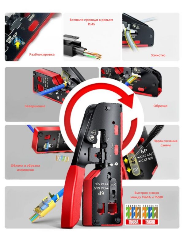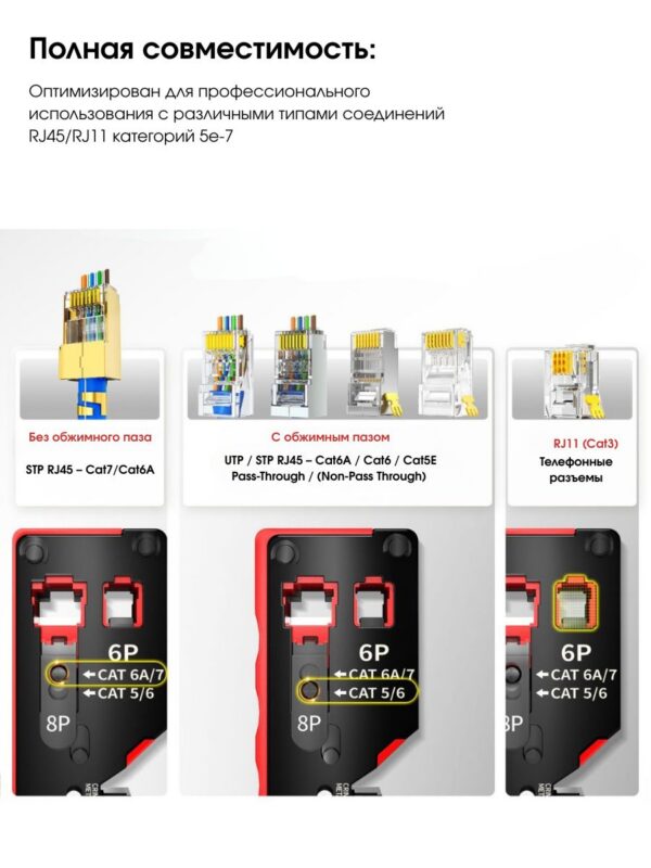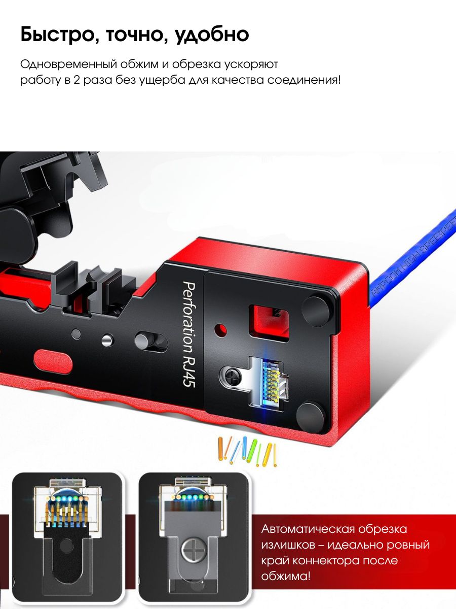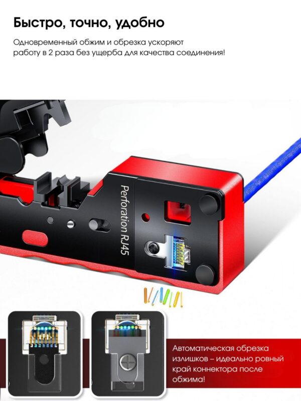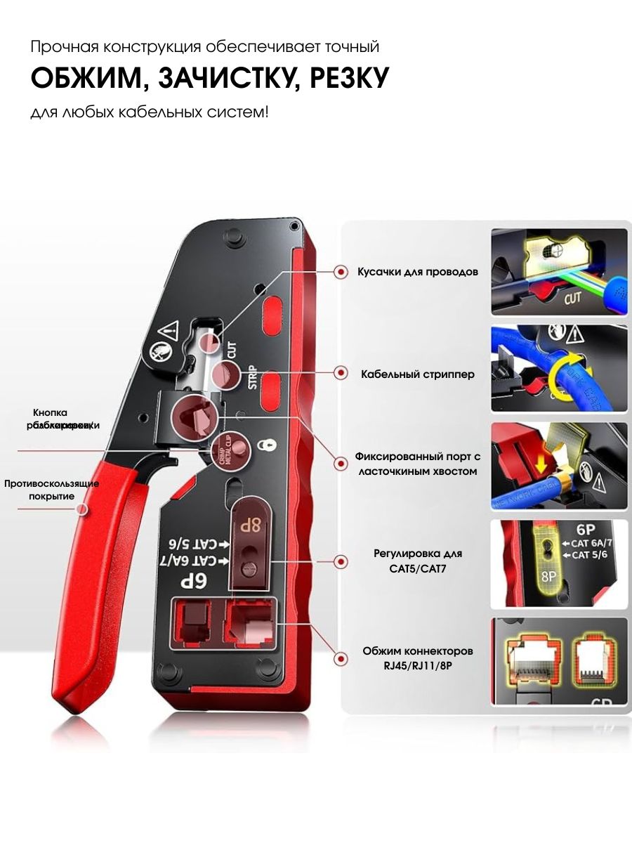 Этот универсальный кримпер подходит для обжима различных типов проводов, включая RJ-45 и RJ-11. Имеет регулировку глубины обжима, что позволяет использовать его для разных типов проводов и размеров соединений.