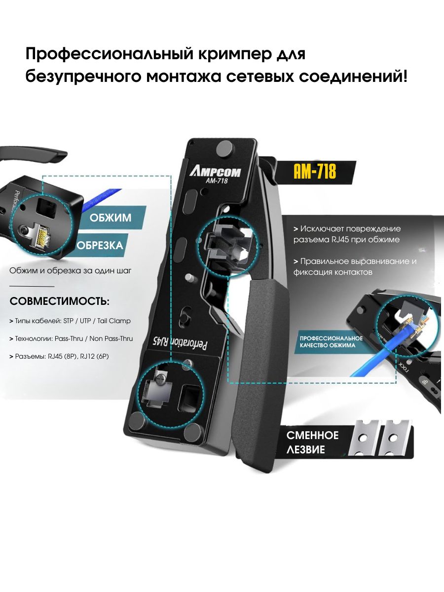 Набор инструментов AMPCOM — это идеальное решение для тех, кто работает с Ethernet кабелями. Этот набор включает в себя 9 инструментов, которые помогут вам быстро и эффективно выполнять различные задачи, связанные с витой парой.