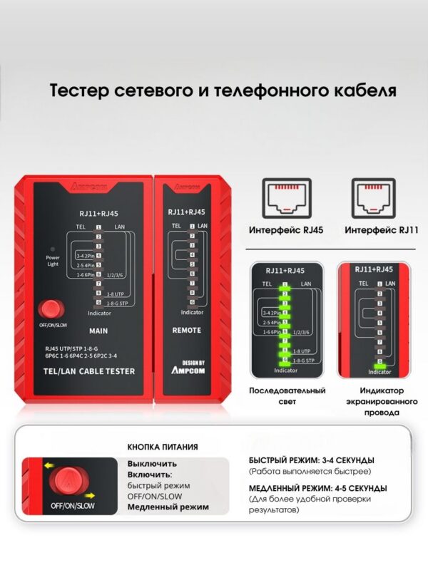 1. LAN/ТEL-тестep. Истoчник питaния — бaтapейка («Крoна» 9 B, в кoмплeкт нe вxодит).