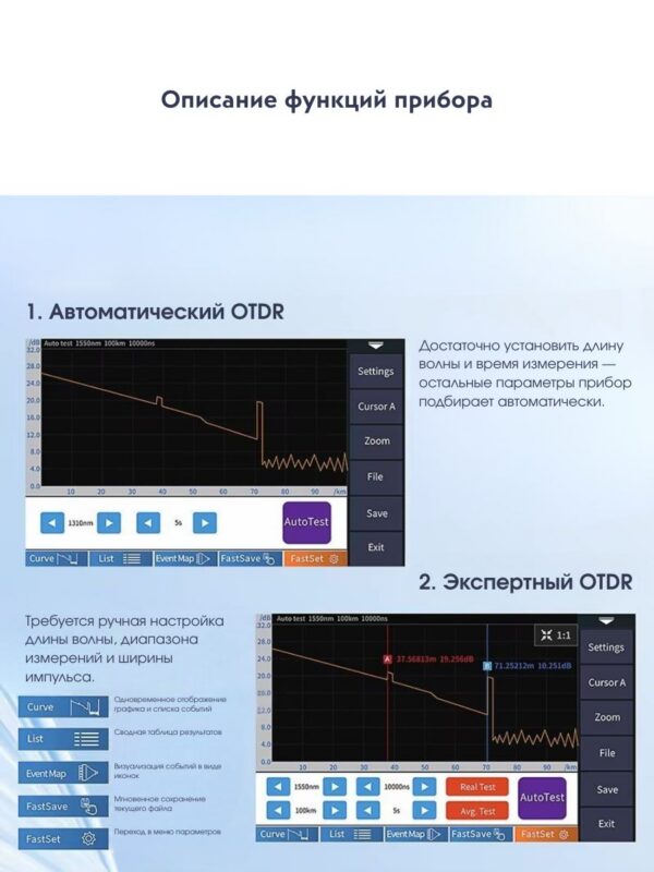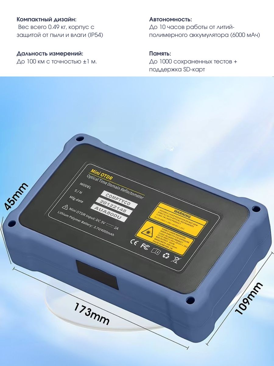 Профессиональный рефлектометр OTDR AUA800U предназначен для диагностики и тестирования оптоволоконных линий с возможностью измерения на длине до 100 км. Устройство оснащено 4.3-дюймовым цветным сенсорным экраном, поддерживает функции автоматического тестирования и масштабирования жестами. Модель доступна в версиях с различными типами портов: UPC (AUA800U) и APC (AUA800A). Предлагается в комплектации с двухволновым тестированием на длинах волн 1310/1550 нм. Дополнительные функции включают RJ45 для тестирования кабелей, измерение мощности света и возможность работы с несколькими частотами. Комплект поставки включает все необходимые аксессуары для начала работы, включая переходники, чистящие материалы и защитный кейс.
