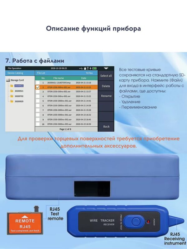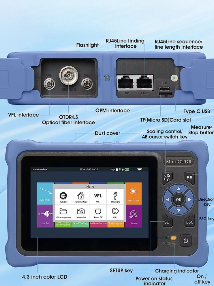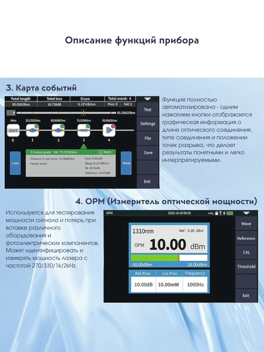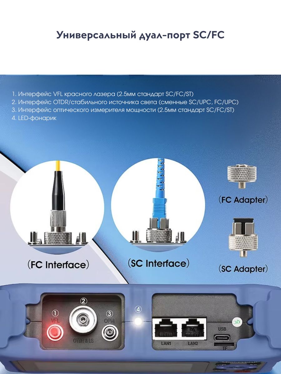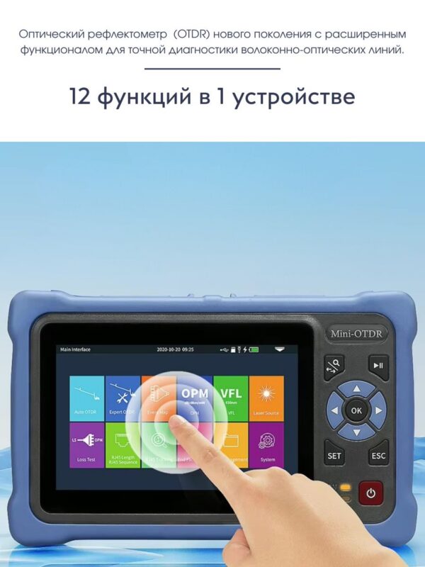| Комплектация | Рефлектометр, адаптер SC, гарантийный сертификат, адаптер (EC), кабель type-C, приемник, Сумка для переноски |