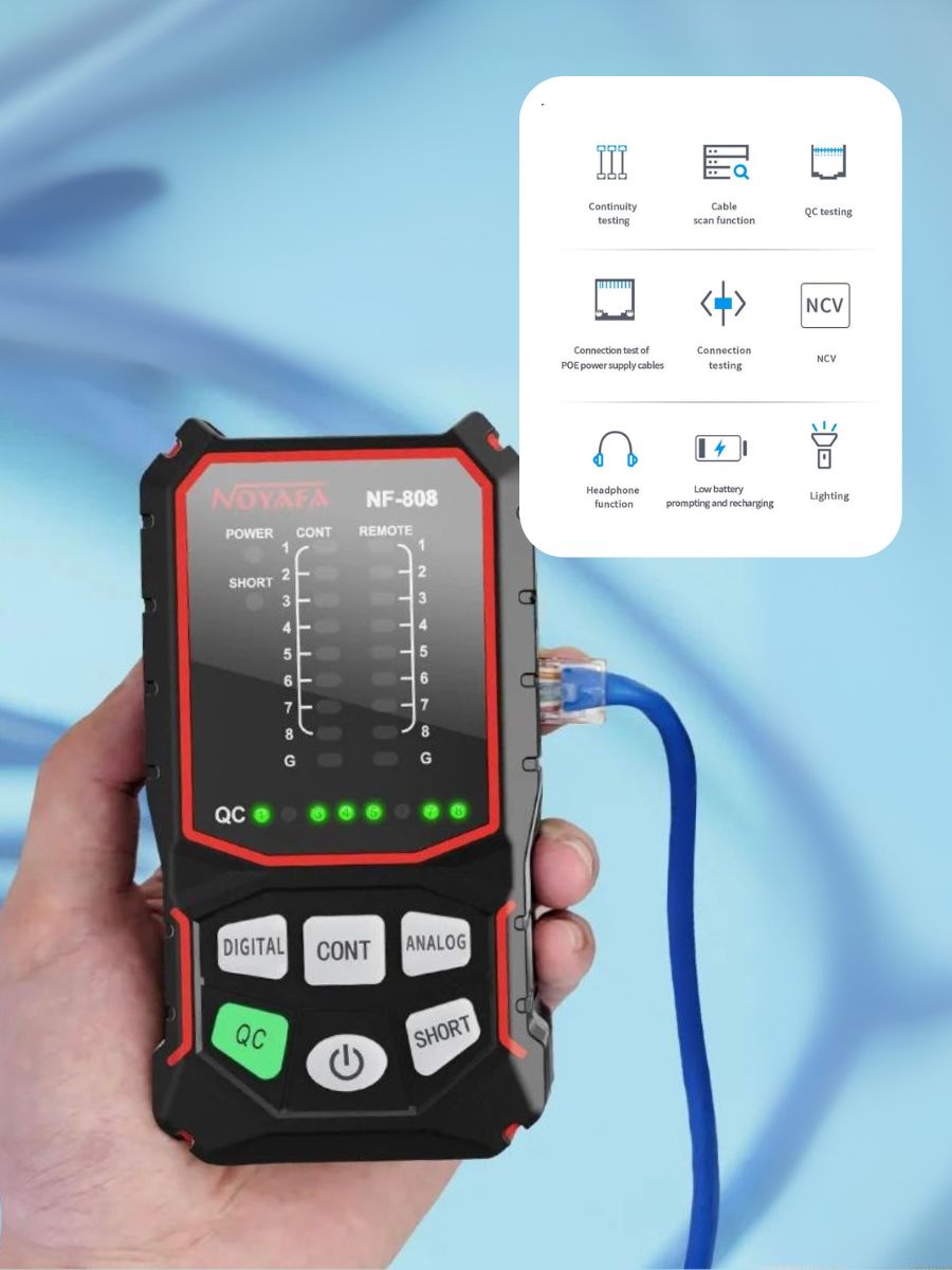 Кабельный тестер Noyafa NF-808 — это надежное и удобное устройство, предназначенное для проверки работоспособности сетевых кабелей. Этот тестер идеально подходит как для профессионалов, так и для домашних пользователей, обеспечивая простоту в использовании и высокую эффективность.
