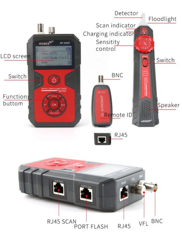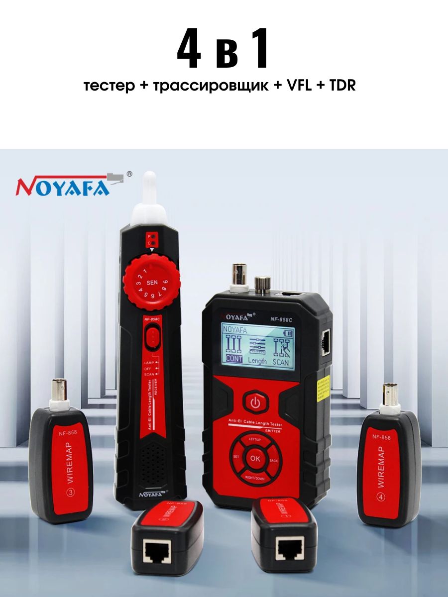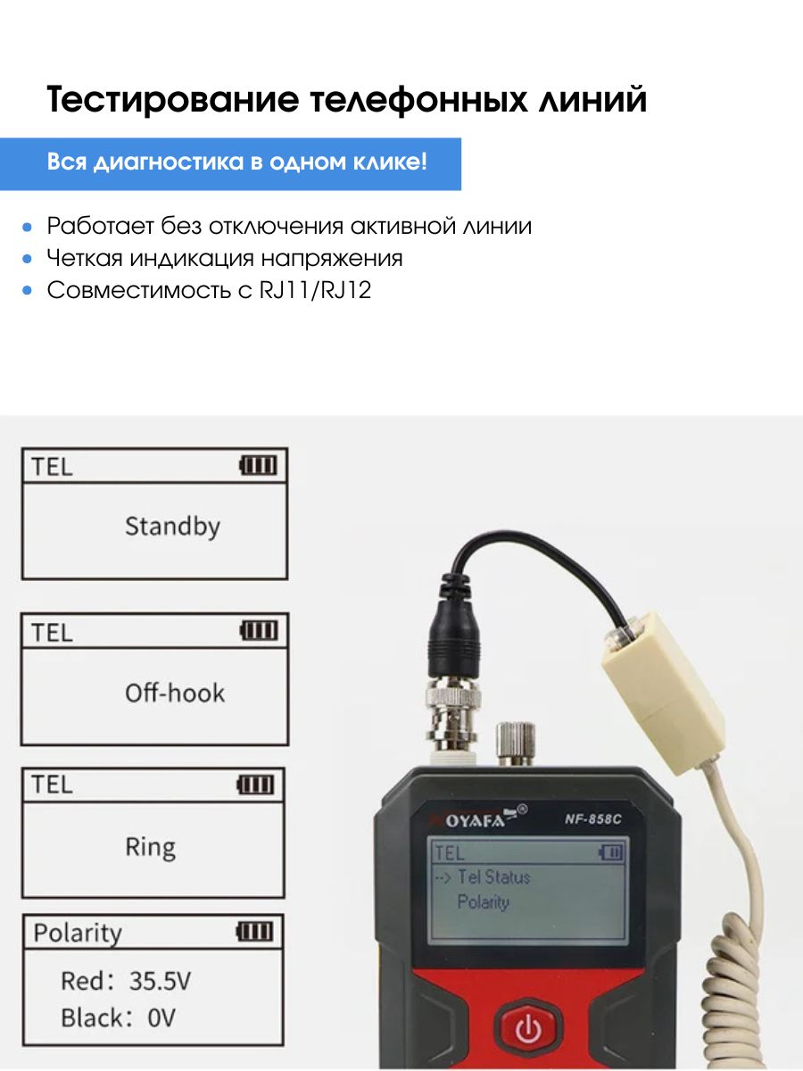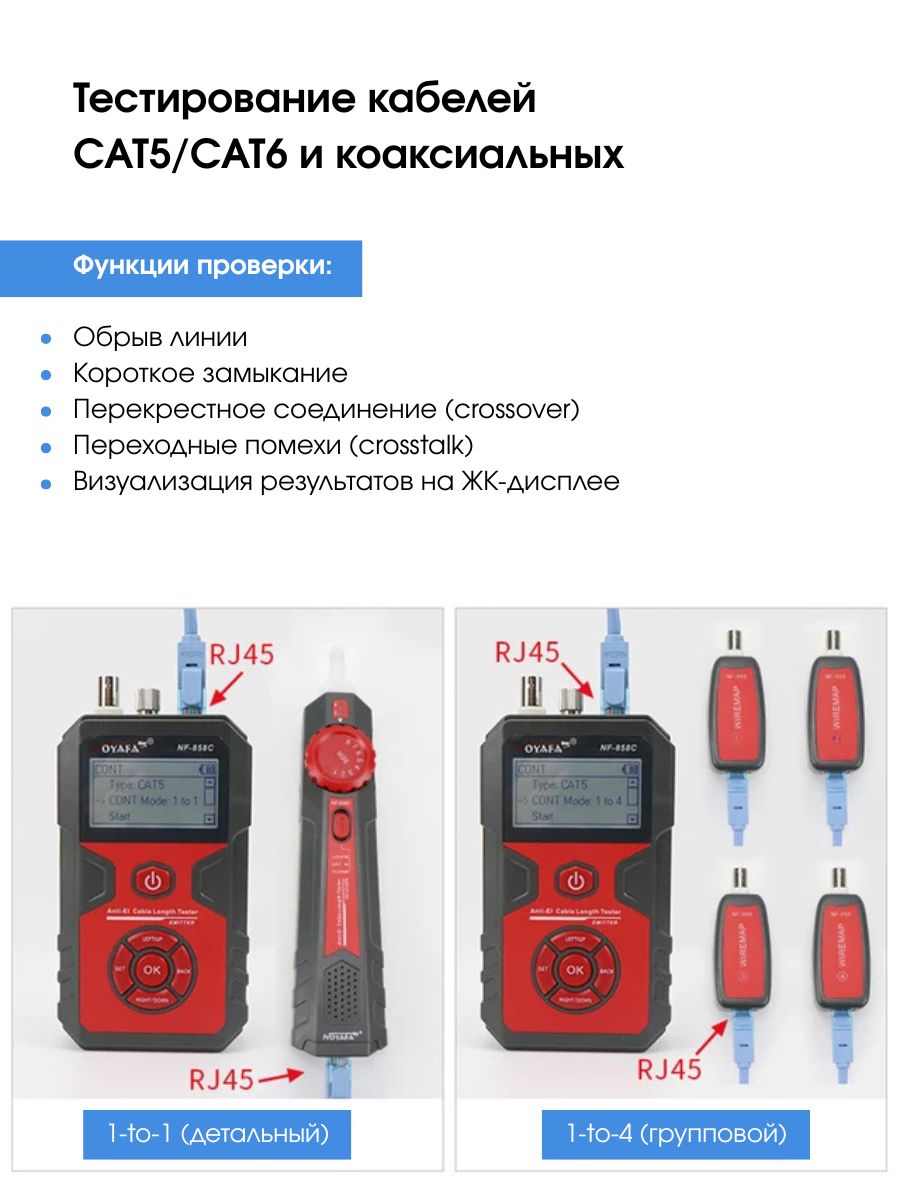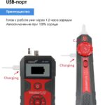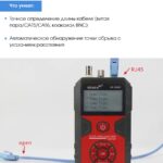 Отображение функций и неисправностей — длина, кроссировка витых пар, сканирование, прозвнонка, отсутствие адаптера, индикация разряженной батареиРазъемыRJ45, коаксиальный (BNC), VFL, микро-USB