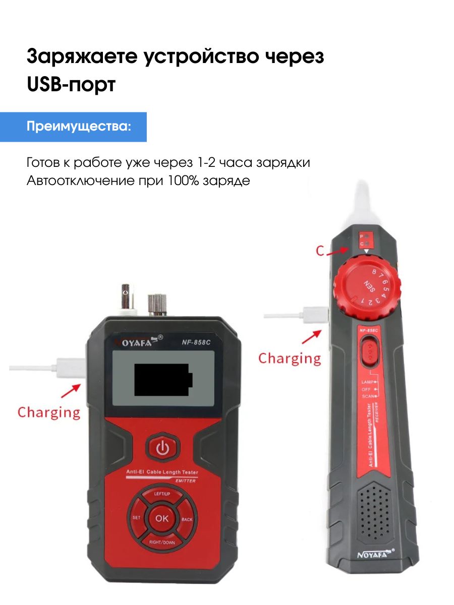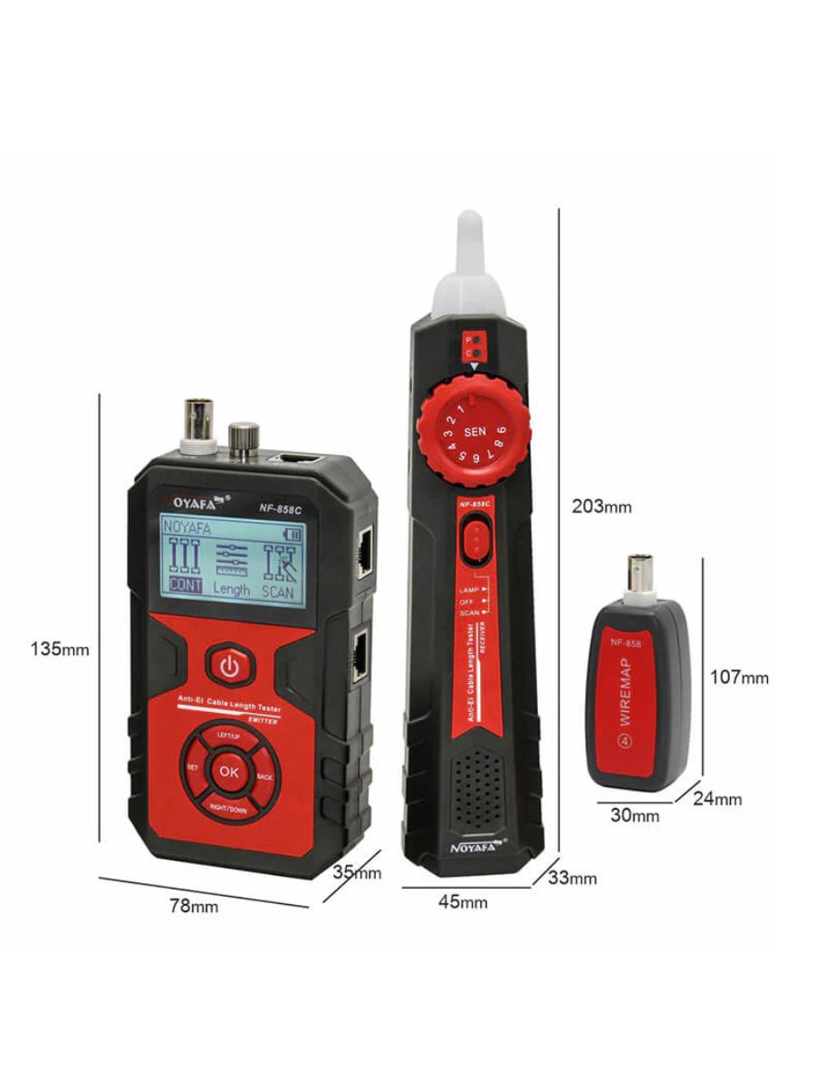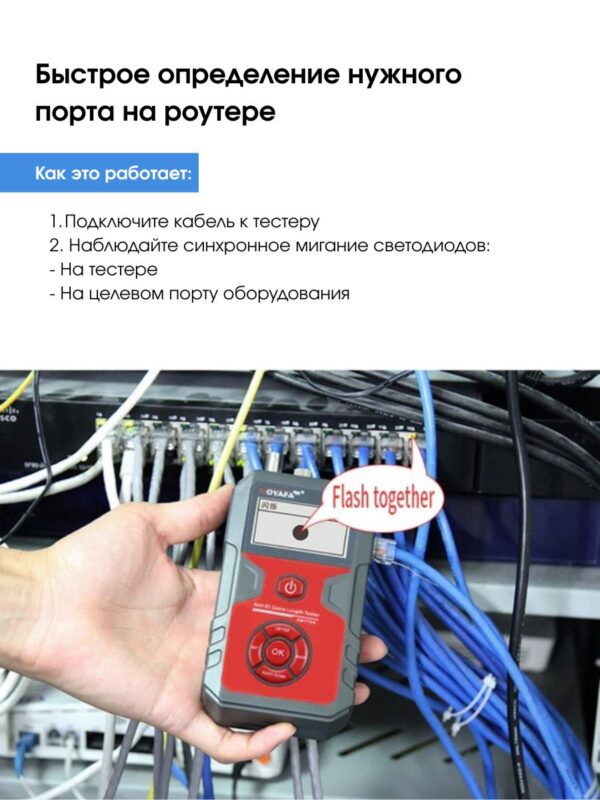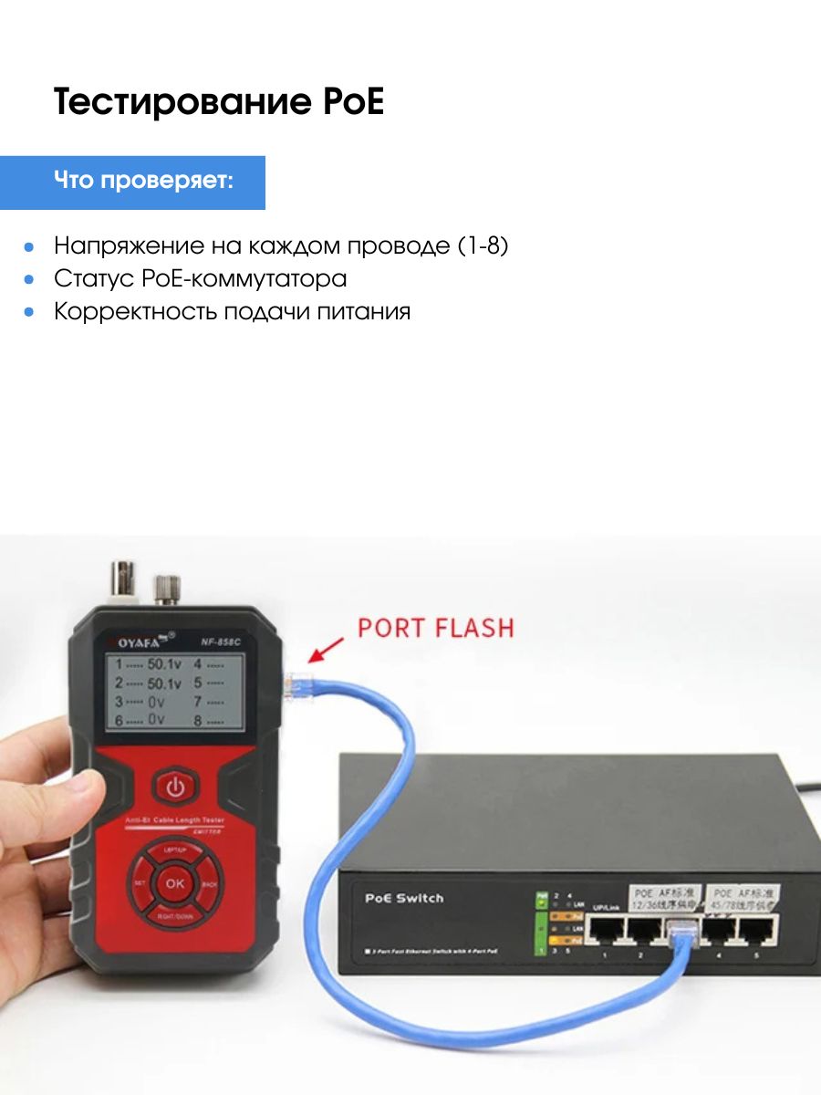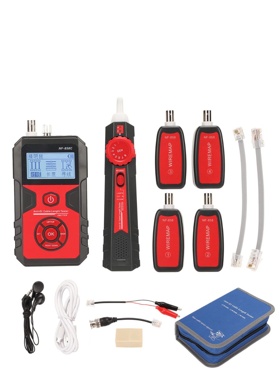 Возможности прозвонка коаксиальных кабелей (BNC) и кабелей из витых пар категории 5 и категории 6 (Cat 5, Cat 6) измерение длины коаксиальных кабелей и кабелей категории 5 и категории 6 до 2000 м трассировка сетевых и коаксиальных кабелей функция проблесковой индикации, позволяющая напрямую находить требуемые кабели, подключенные к сетевому коммутатору с поддержкой питания подключенных устройств по витой паре (PoE) визуализация мест повреждений оптоволоконных кабелей красным светом проверка напряжения на сетевом коммутаторе с поддержкой питания подключенных устройств по витой паре (PoE)
