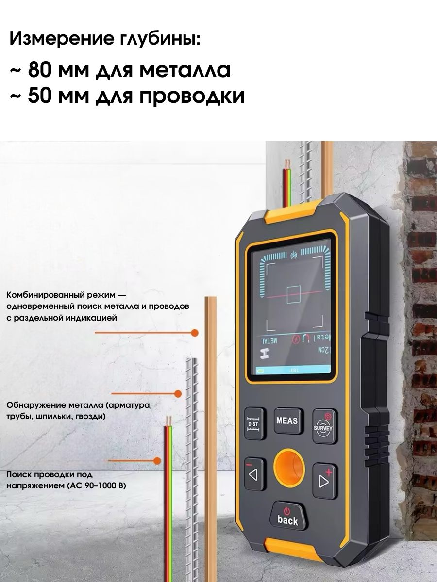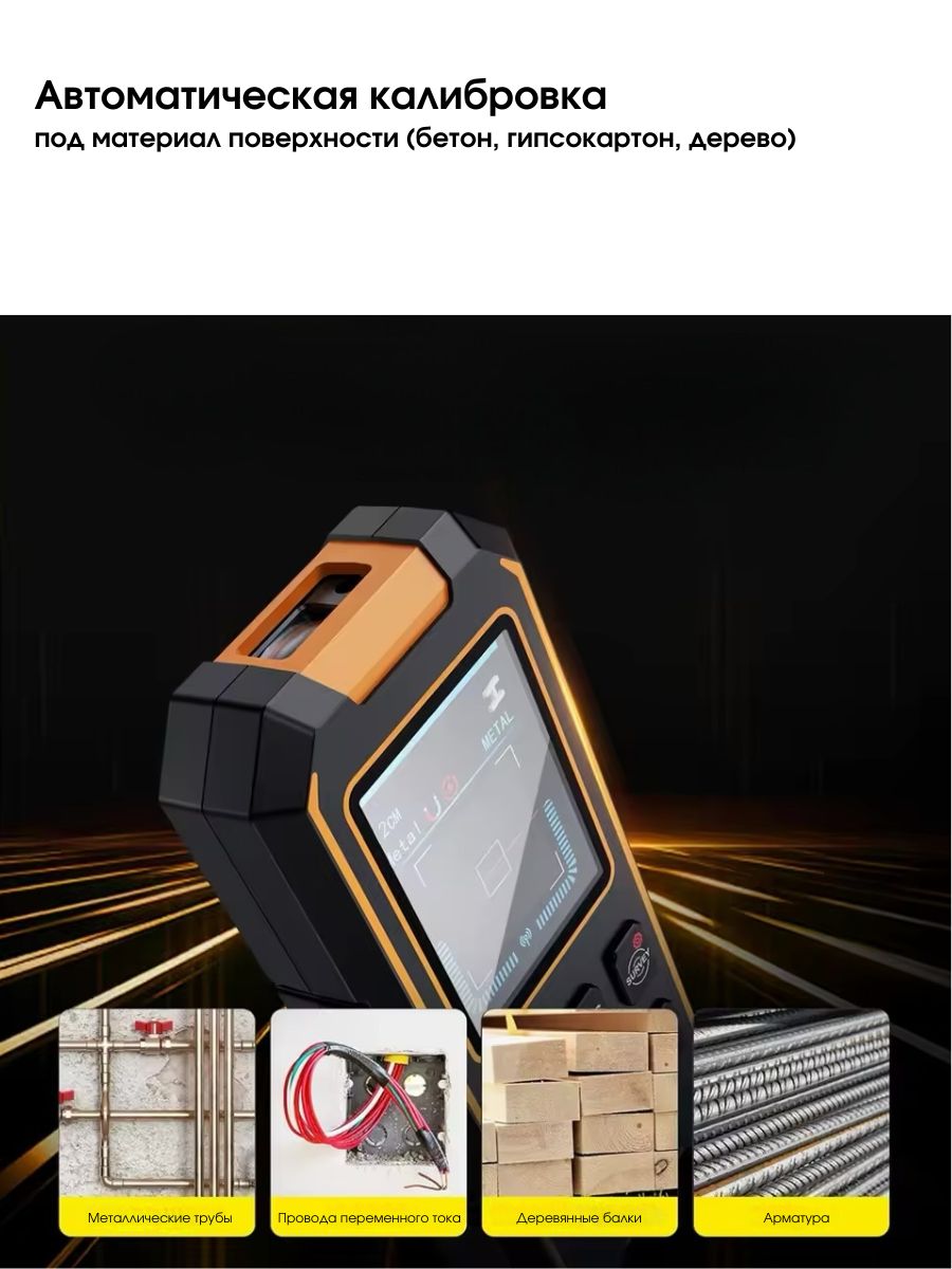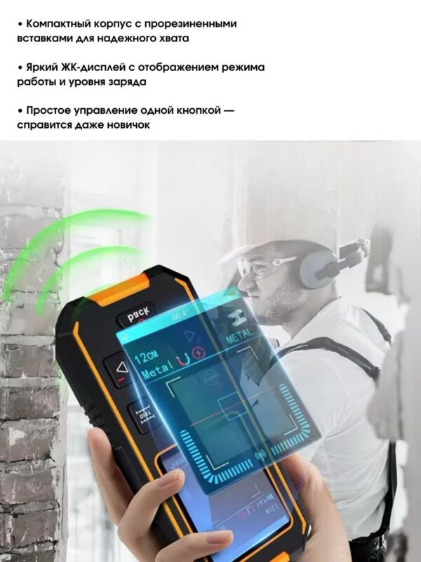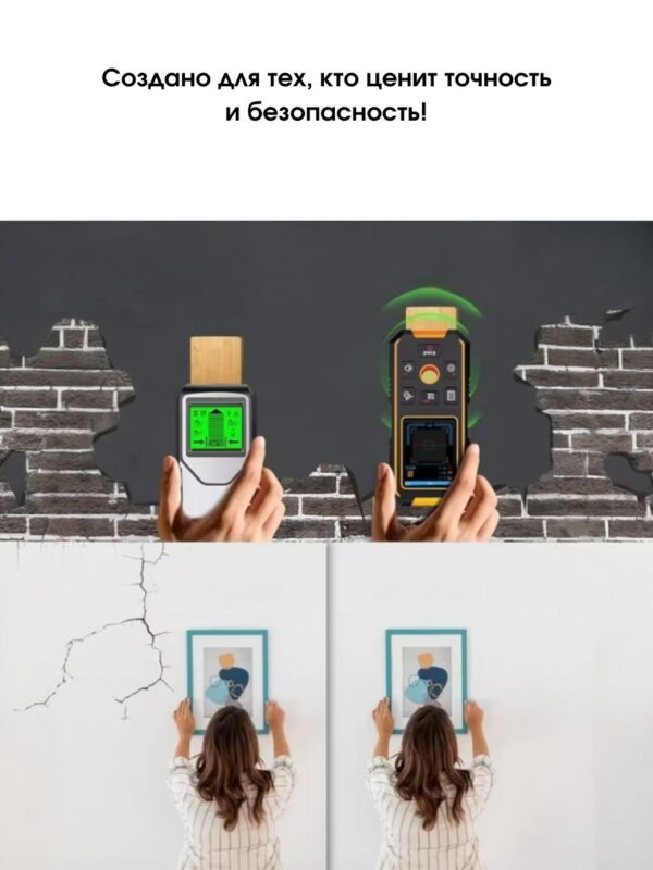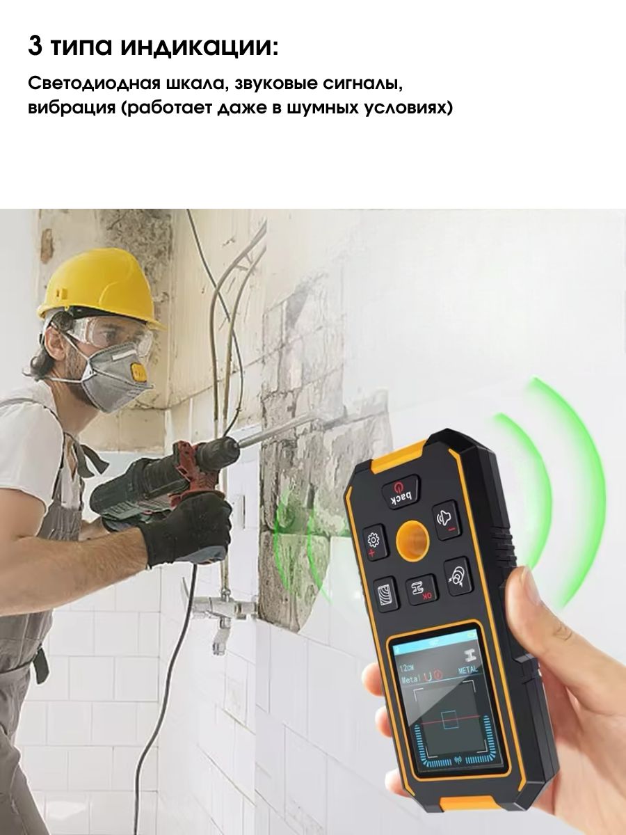 - Три режима обнаружения, быстрое измерение, точное позиционирование – высокочувствительные датчики обнаруживают металл, дерево и электрические провода на глубине до 100 мм, обеспечивая безопасное и точное сверление.