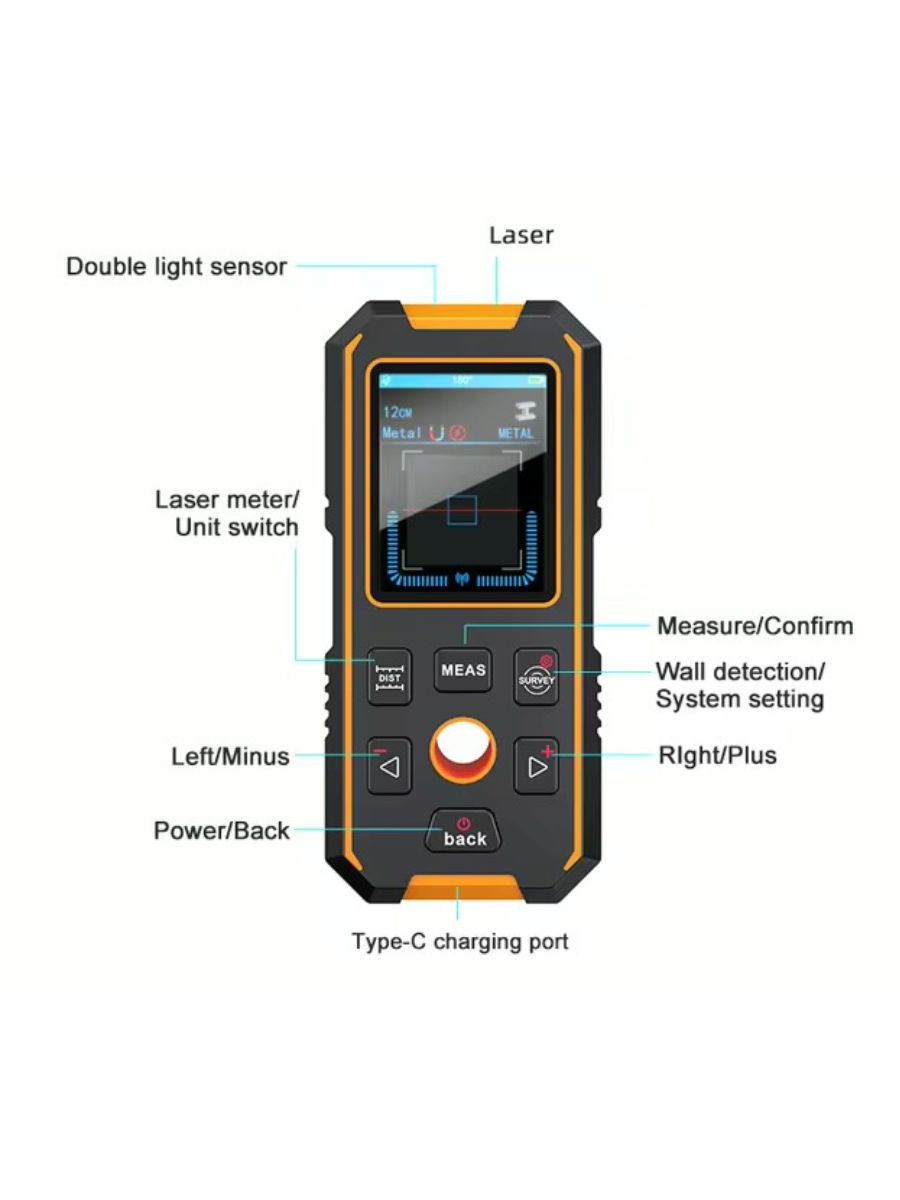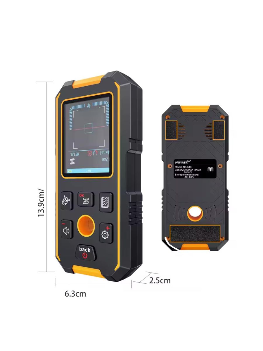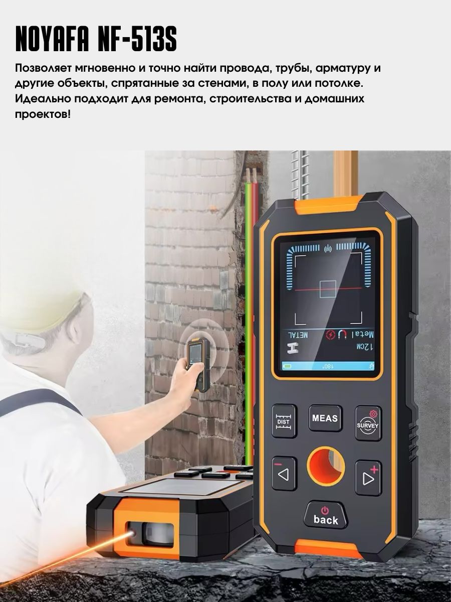 - Три режима обнаружения, быстрое измерение, точное позиционирование – высокочувствительные датчики обнаруживают металл, дерево и электрические провода на глубине до 100 мм, обеспечивая безопасное и точное сверление.