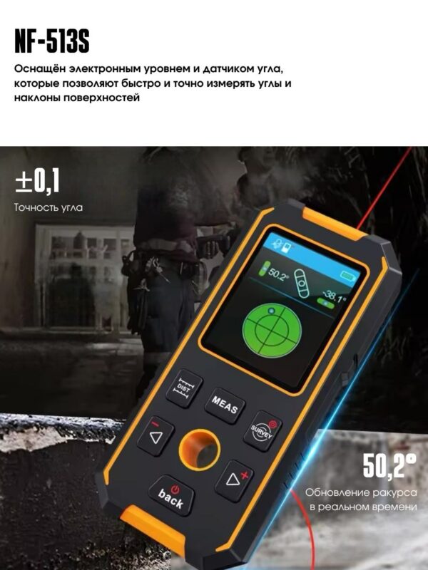 - Расширенные функции версии NF-513S – лазерное измерение расстояния с точностью ±1 мм, поддержка нескольких режимов измерения (одиночное, площадь, объем и др.), а также импортные оптические линзы с низким энергопотреблением.