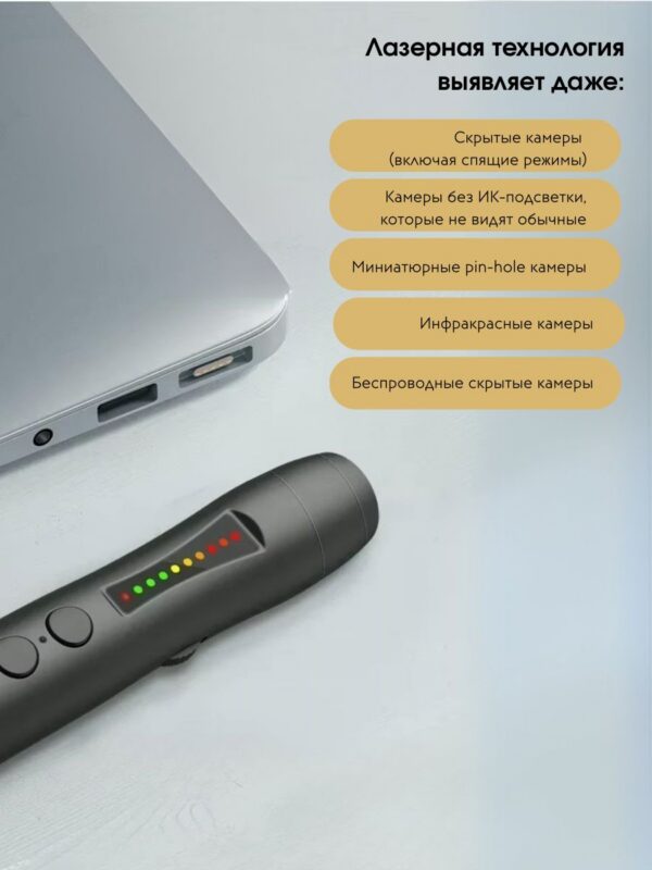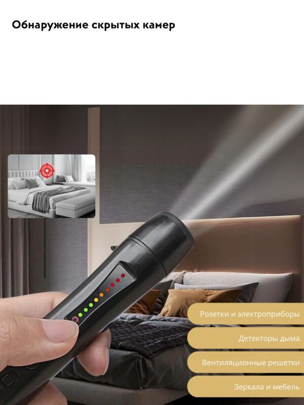 Прибор выполняет поиск радиочастотных сигналов для выявления ошибок в беспроводных сетях, фиксирует магнитные поля для обнаружения GPS-трекеров с магнитным креплением, а также определяет наличие скрытых камер — как проводных, так и беспроводных.