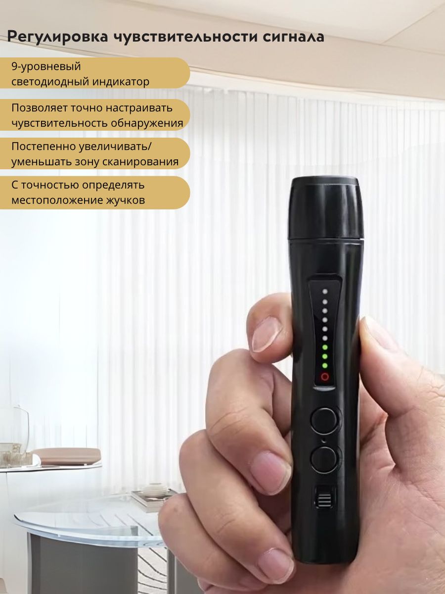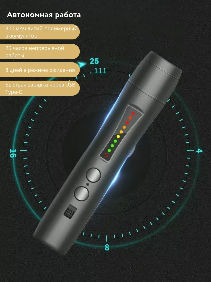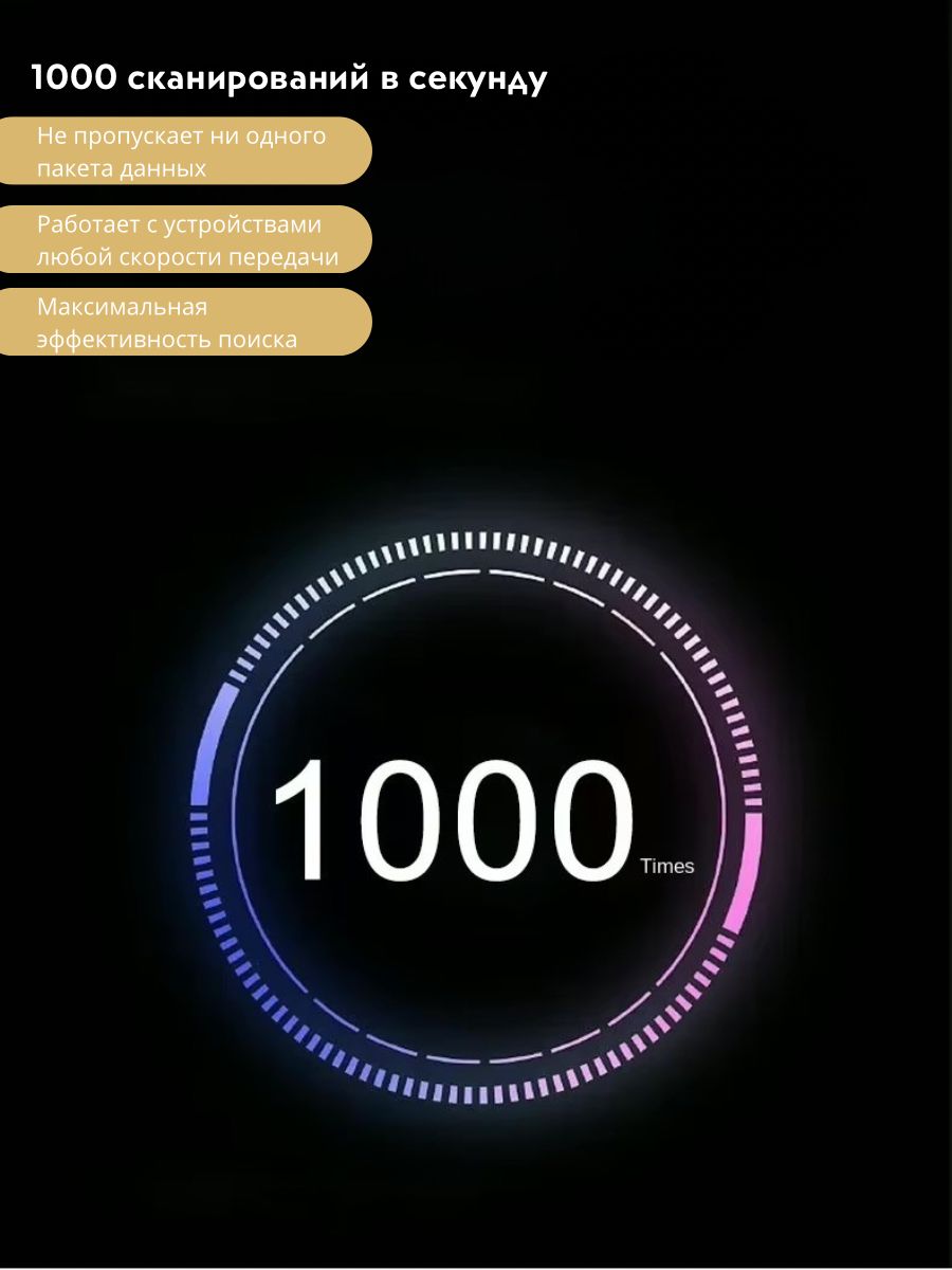 Прибор выполняет поиск радиочастотных сигналов для выявления ошибок в беспроводных сетях, фиксирует магнитные поля для обнаружения GPS-трекеров с магнитным креплением, а также определяет наличие скрытых камер — как проводных, так и беспроводных.