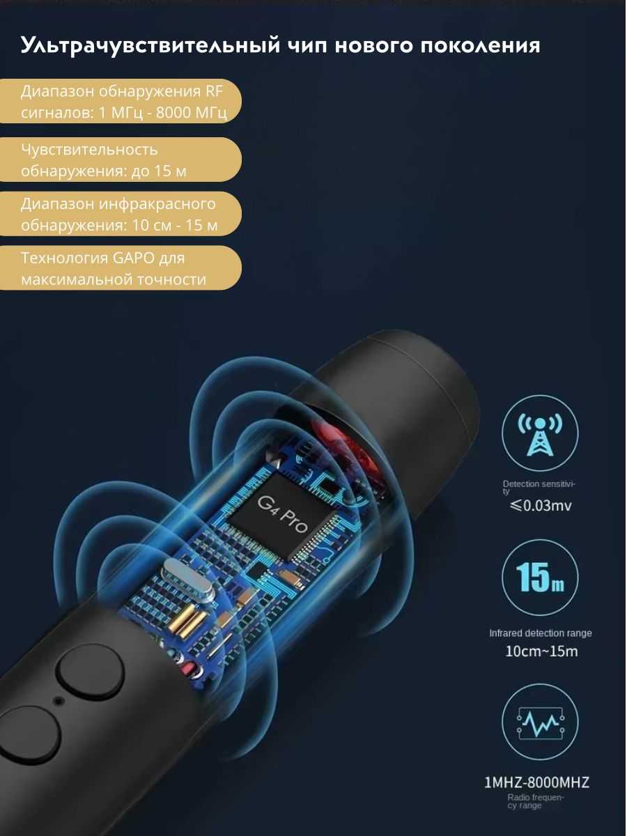 - Обнаруживает SIM-баги и GPS-локаторы, работающие в диапазонах 2G, 3G, 4G.