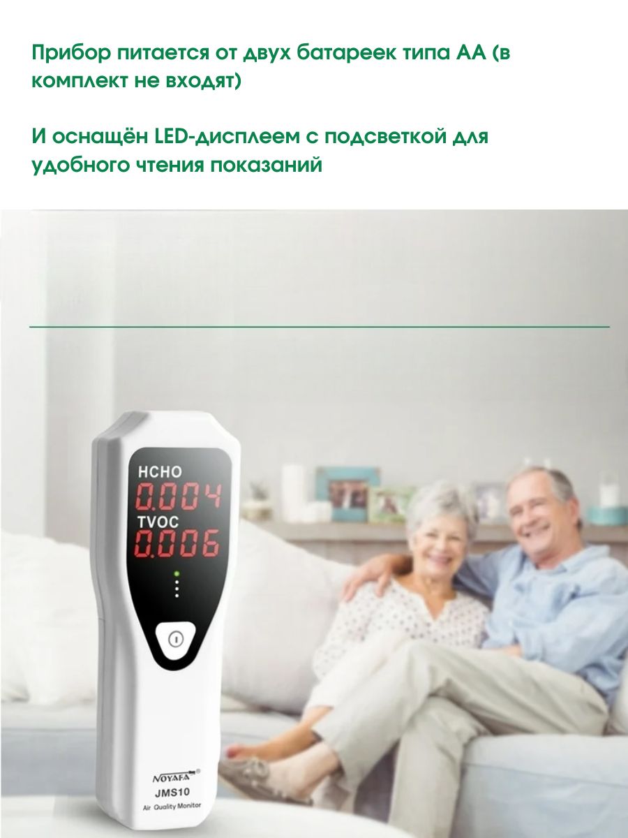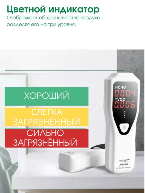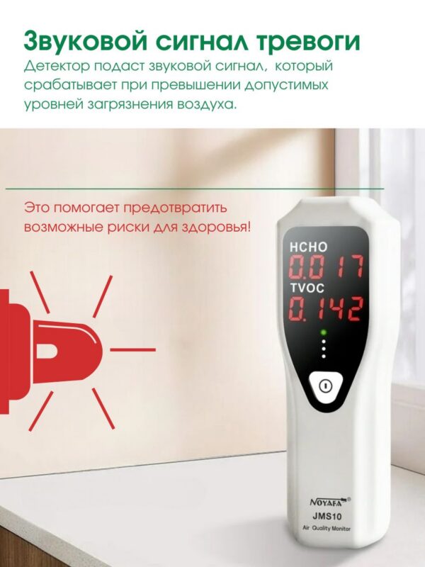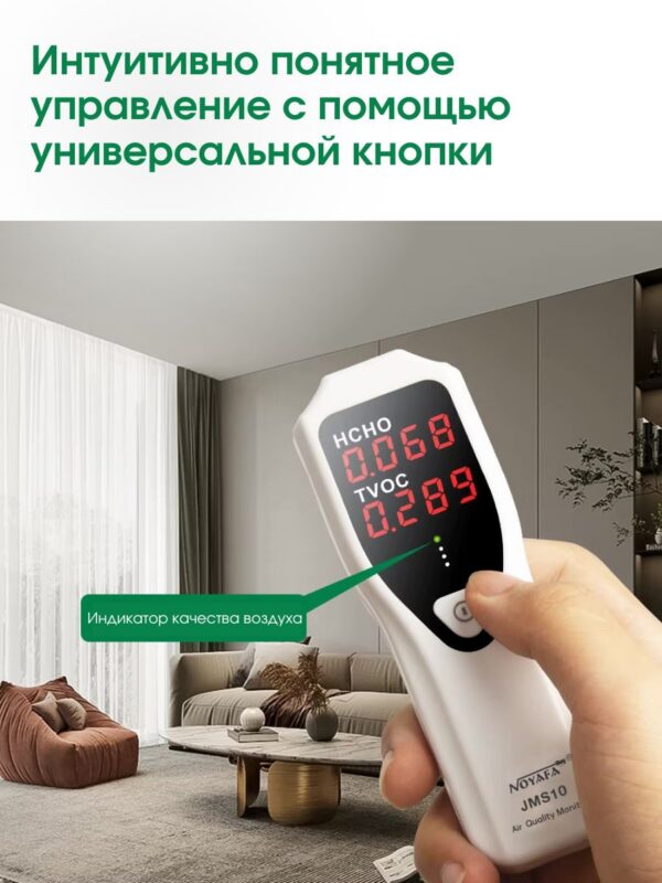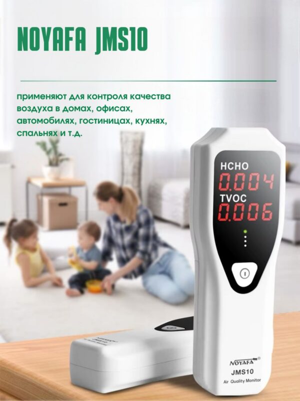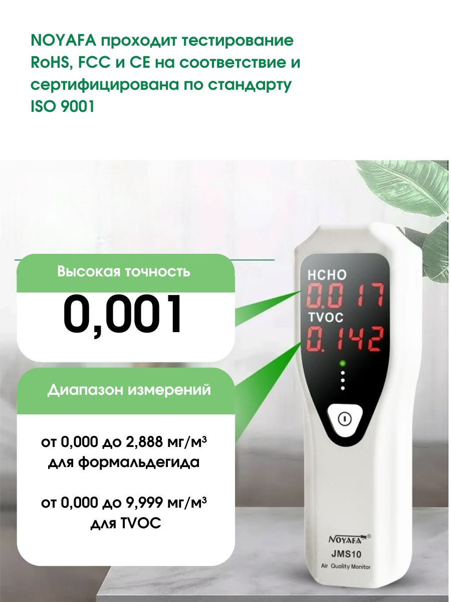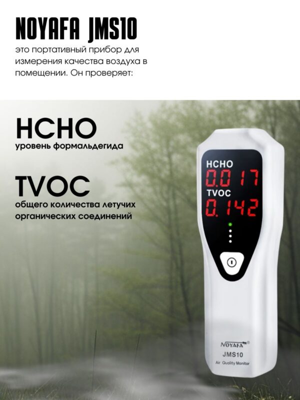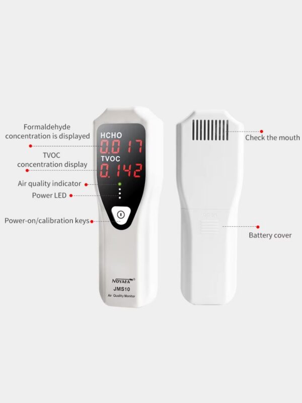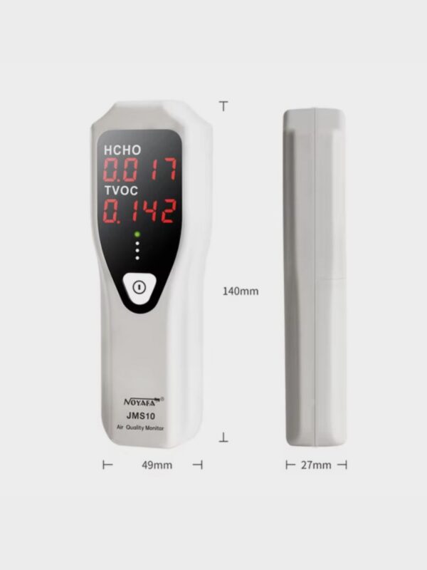 NOYAFA JMS10 – надежный и простой в использовании газовый детектор, обеспечивающий обнаружение формальдегида (HCHO) и летучих органических соединений (TVOC) в воздухе с точностью до 0,001 ppm. Предназначен для контроля качества воздуха на рабочих местах и жилых помещениях.