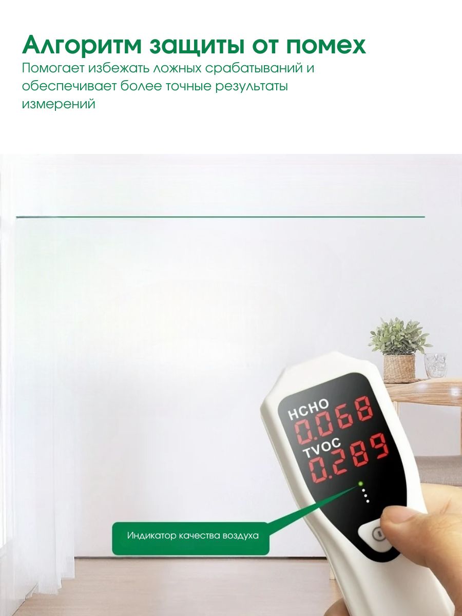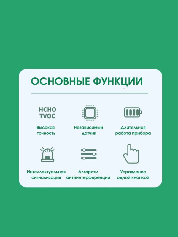 Устройство имеет эргономичный дизайн, незначительные габариты и вес, что обеспечивает удобное использование в разных условиях. Детектор оснащен усовершенствованными датчиками, которые могут точно обнаруживать формальдегид (HCHO) и общие летучие органические соединения (TVOC), интуитивно понятным управлением с помощью универсальной кнопки питания/калибровки и аккумуляторами большой емкости, которые можно перезаряжать, обеспечивающих длительную работу даже в самых тяжелых условиях.