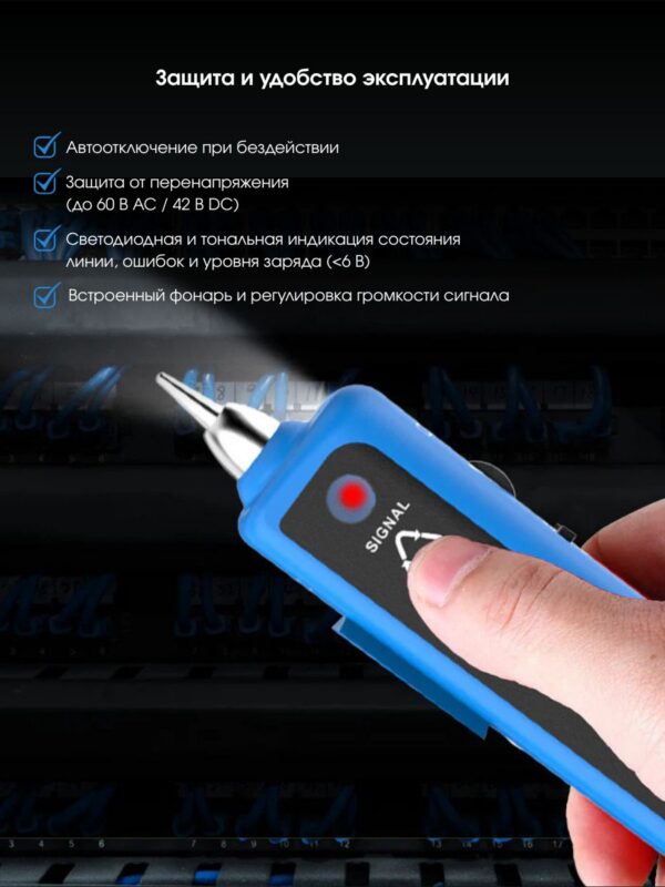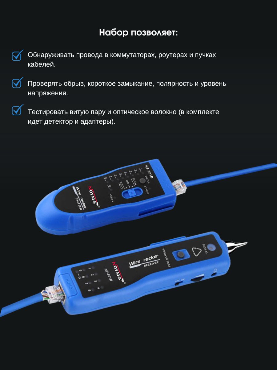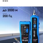 Защита от повышенного напряжения АС < 60 В DC < 42 В Индикация светодиодная и тоновая индикация состояния соединения и ошибок Индикация низкого заряда батареи питания < 6 В Встроенный светодиодный фонарь — есть Регулировка громкости тонового сигнала Автоотключение питания при длительном неиспользовании прибор отключается автоматически Разъемы RJ45, RJ11 Тип батареи питания DC 9 В Характеристики приемника NF-801B Частота генерируемого сигнала 200 кГц Максимальный рабочий ток 30 мА Разъемы — микрофон Тип батареи питания DC 9 В Функцииобнаружение телефонного провода в коммутаторе, витой пары на роутере и в пучке, электрических проводов, функция тестирования витой пары проверка короткого замыкания или обрыва цепи, полярности и индикация уровня постоянного напряжения Общие характеристики Рабочая температура -10°С ~ +50°С Влажность 30 — 90% Вес набора ∼ 1500 г