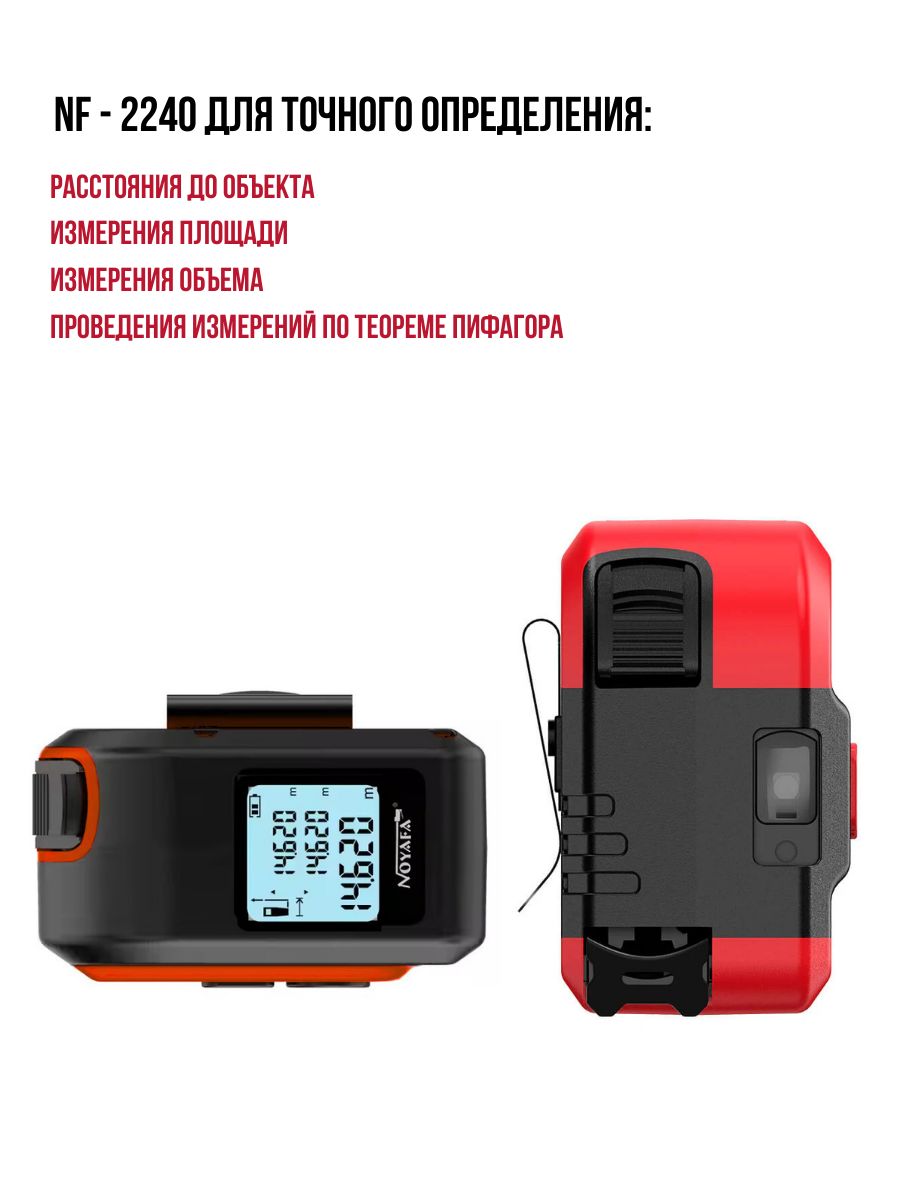 NOYAFA NF-2240 – портативное, компактное устройство для точного определения расстояния до объекта, измерения площади, объема и проведения измерений по теореме Пифагора. Эта лазерная рулетка-дальномер сочетает в себе два прибора – 40-метровый лазерный измеритель и 5-метровую рулетку. Измеритель имеет эргономичный дизайн и небольшие габариты для удобства использования в полевых и промышленных условиях.