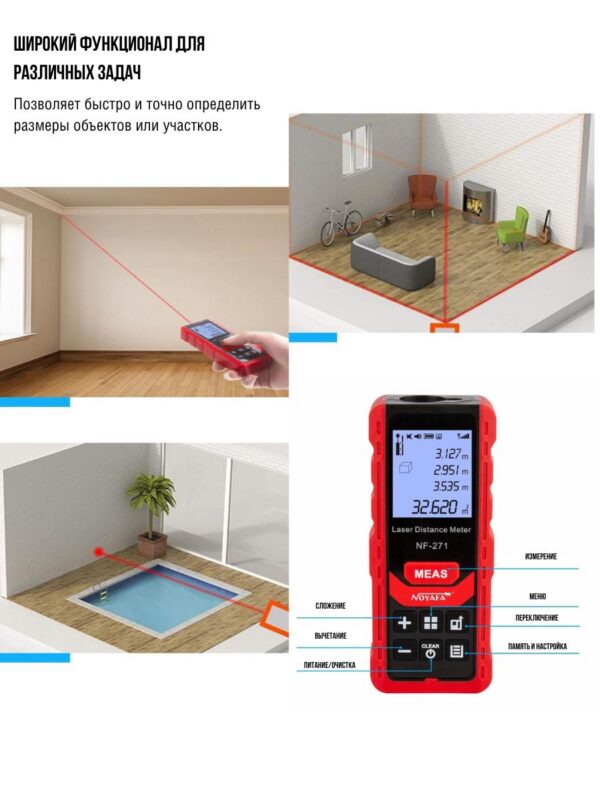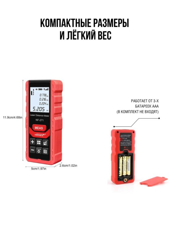 - Яркий дисплей — лазерное измерительное устройство оснащено цифровым экраном с подсветкой и экраном FSNT, на котором отображаются точные измерения в дюймах, футах или метрах.