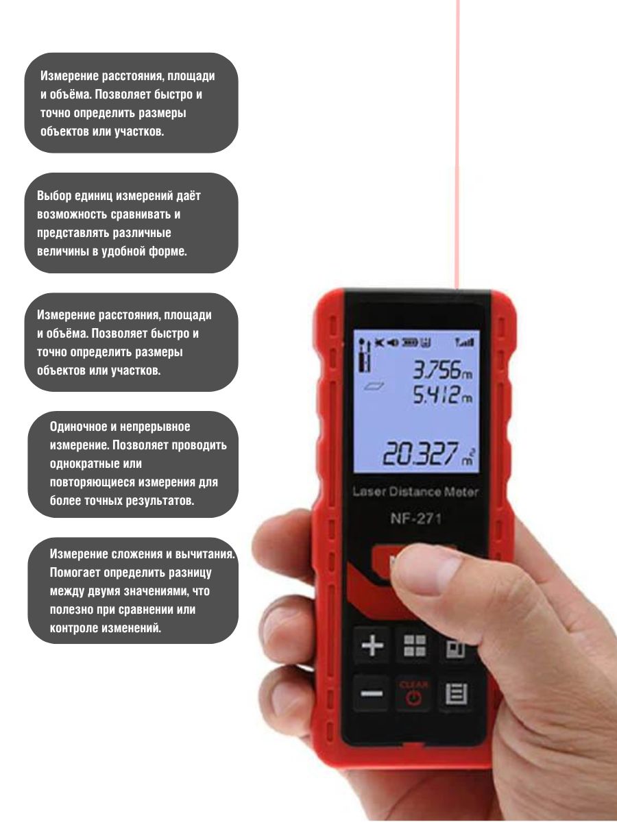 - Измерение с точностью — Одиночное/непрерывное измерение, положительное и отрицательное измерение, а также автоматическое горизонтальное/вертикальное измерение. (точность 50м+-2 мм)