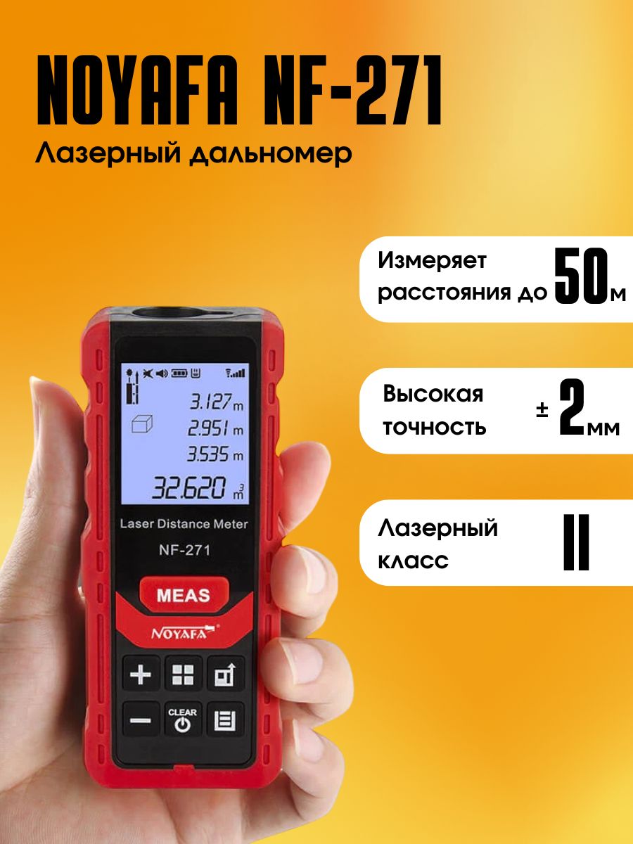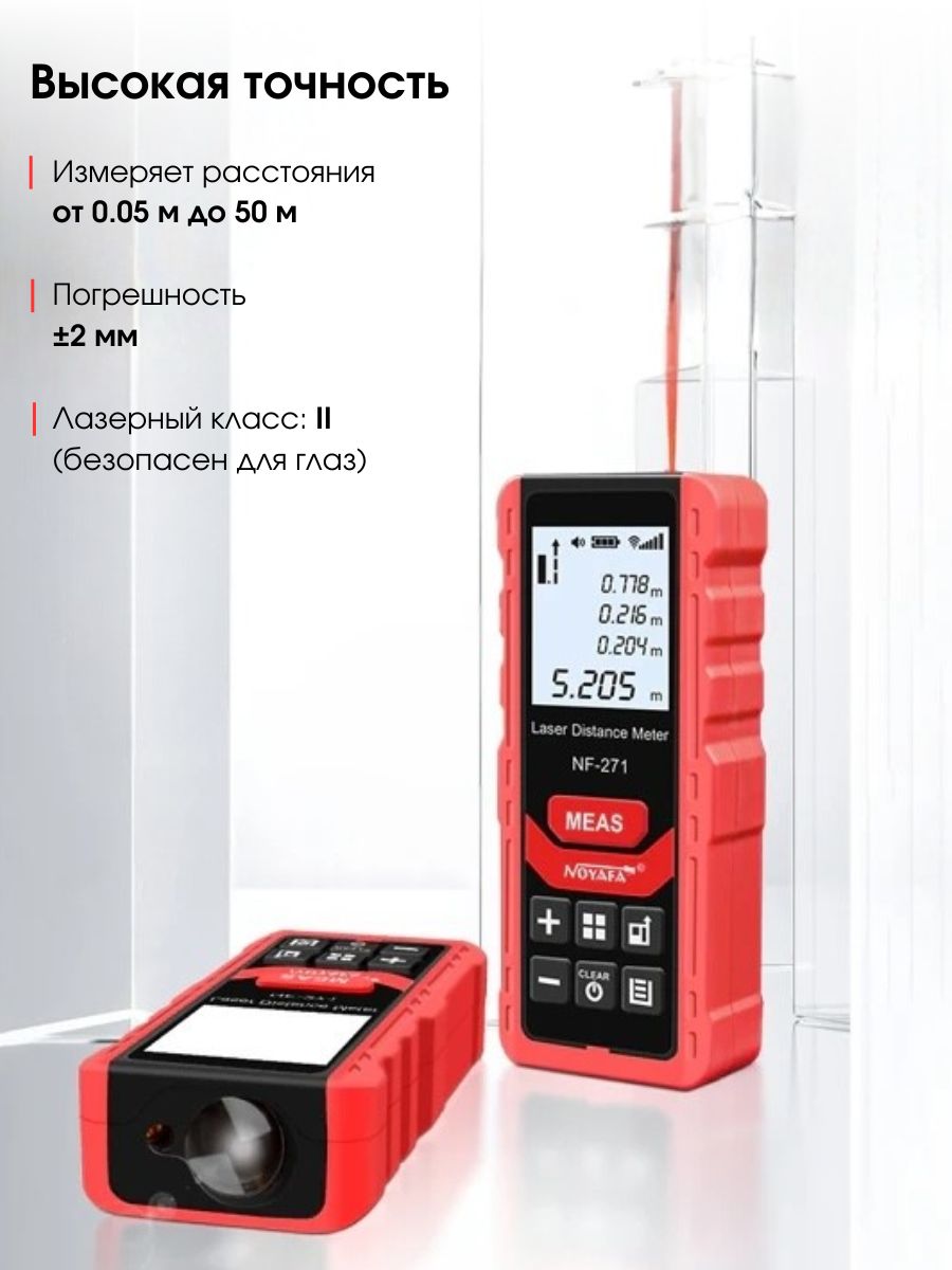 Лазерный измеритель расстояния Noyafa NF-271/50 — эффективный инструмент для точных замеров. Точность измерений составляет ± 1,5 мм. Дальность действия достигает 50 метров, что подходит для работы как в помещениях, так и на улице. Имеется возможность непрерывного измерения, одиночного замера, а также расчета площади и объема. Измеритель позволяет выполнять косвенные замеры по формуле Пифагора, что упрощает работу с труднодоступными местами.