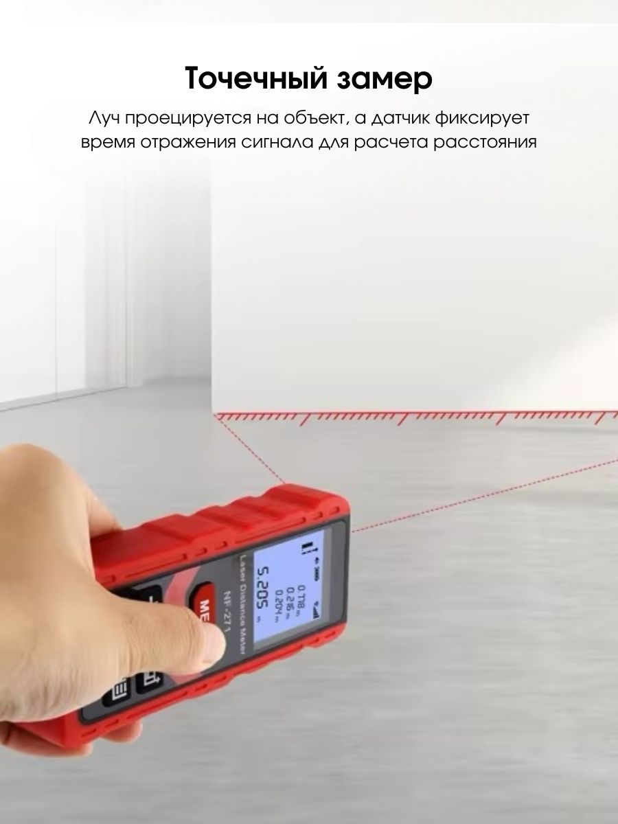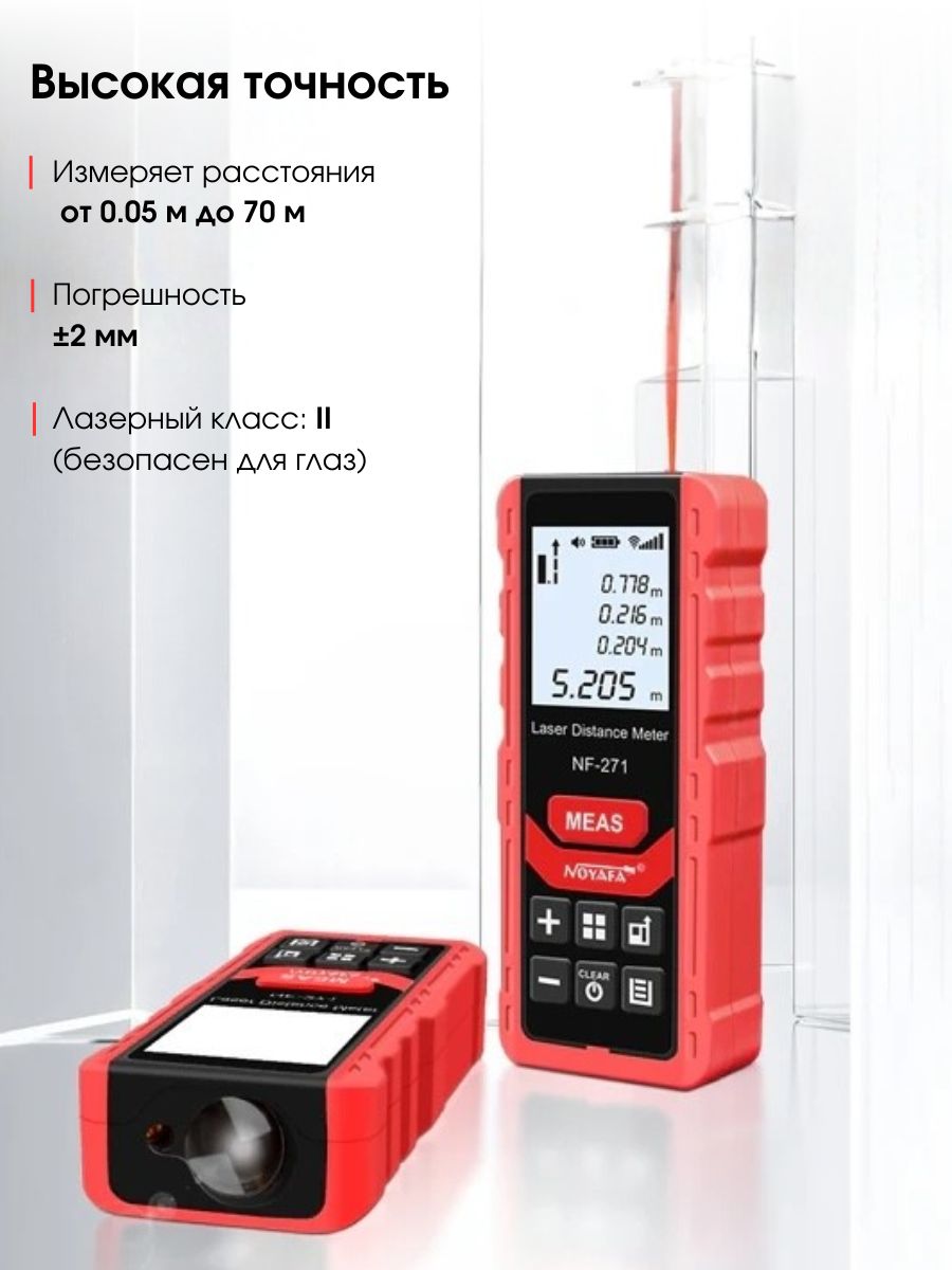 Лазерный измеритель расстояния Noyafa NF-271/70 — эффективный инструмент для точных замеров. Точность измерений составляет ± 1,5 мм. Дальность действия достигает 70 метров, что подходит для работы как в помещениях, так и на улице. Имеется возможность непрерывного измерения, одиночного замера, а также расчета площади и объема. Измеритель позволяет выполнять косвенные замеры по формуле Пифагора, что упрощает работу с труднодоступными местами.