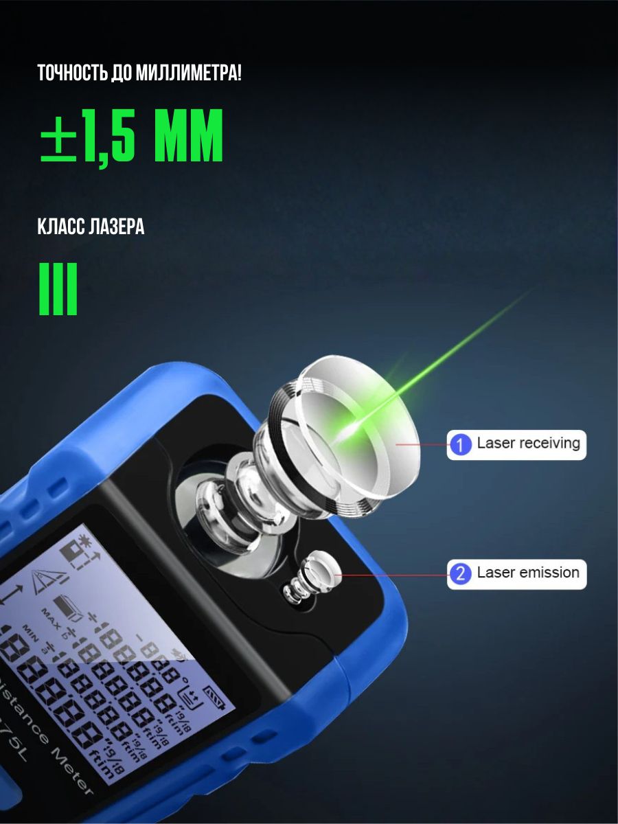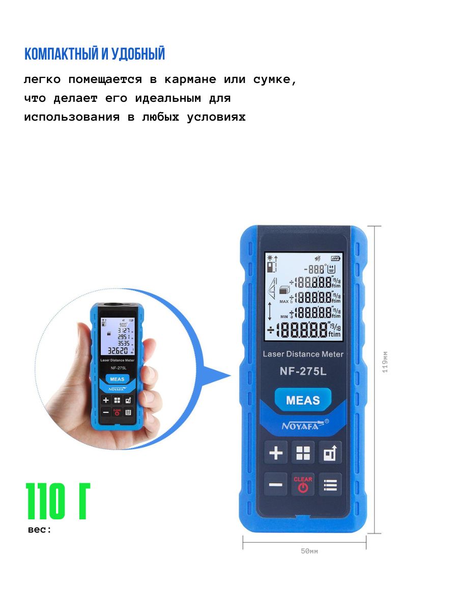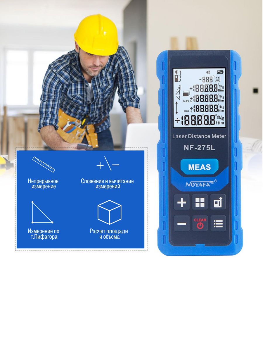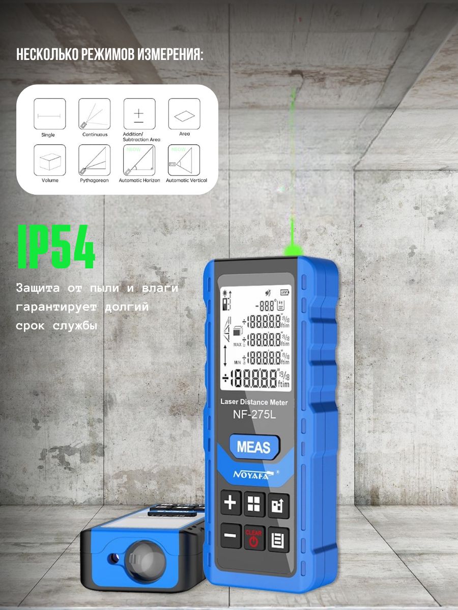 NOYAFA NF-275L-100M – современный портативный профессиональный прибор производства компании NOYAFA для измерения расстояния в диапазоне от 0,1 до 100 м, угла наклона, расчета площади, объема и значения высоты по теореме Пифагора. Прибор быстро проводит измерение как от верхней, так и нижней кромки корпуса с высокой точностью ±1,5 мм.