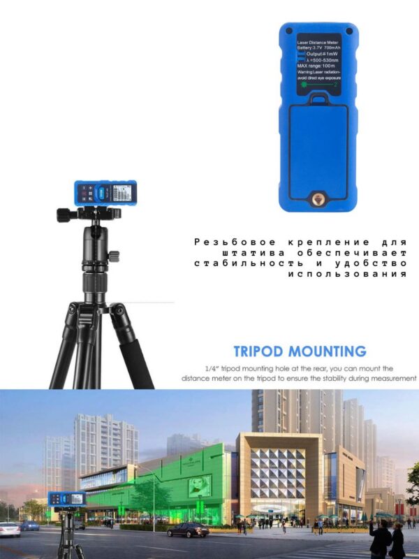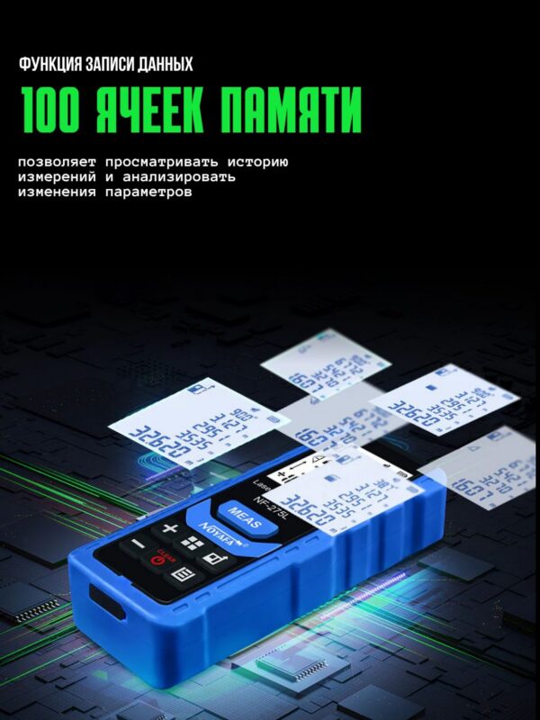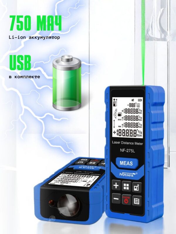 Эргономичный дизайн, крепкий корпус, небольшие габариты и вес прибора обеспечивают удобное использование в полевых и промышленных условиях. Лазерная рулетка NF-275L-100M оснащена мощным зеленым лазером, что обеспечивает лучшую стабильность и надежность измерений по сравнению с традиционными красными лазерами, большим многострочным ЖК-дисплеем с яркой подсветкой, внутренней памятью на 99 результатов измерения, mini USB-разъемом для зарядки батареи, голосовым озвучением результатов измерения, цифровым уровнем и вместительной литиевой аккумуляторной батареей 3,7 В, 750 мАч.