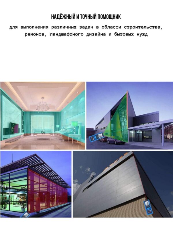 Встроенные функции: измерение расстояния, расчет площади, объема, высоты с использованием теоремы Пифагора, сложение и вычитание результатов измерения, проведение автоматических вертикальных и горизонтальных измерений, непрерывных измерений с фиксацией минимального и максимального измеренного значения, удержание результатов измерений на дисплее, автоматическое выключение лазера через 30 секунд и автоматическое выключение питания через 2 минуты значительно облегчают работу пользователя.