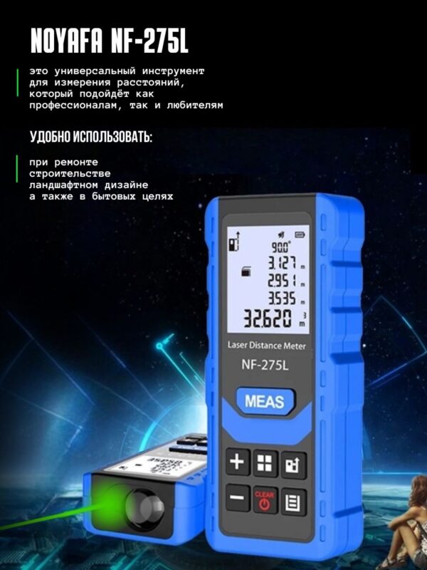 Лазерная рулетка (зеленый лазер) 100 метров NOYAFA NF-275L-1000M используется для проведения промышленных измерений, в строительстве, при монтаже металлоконструкций, для проведения ремонтных работ, для бытовых нужд и т.д.