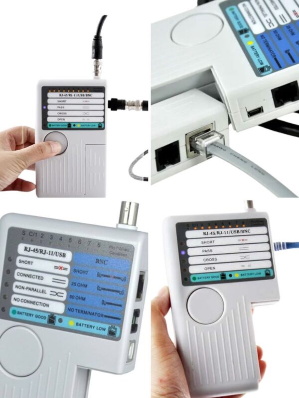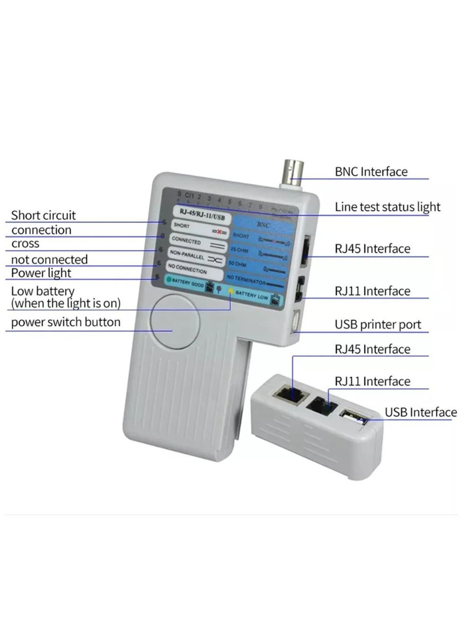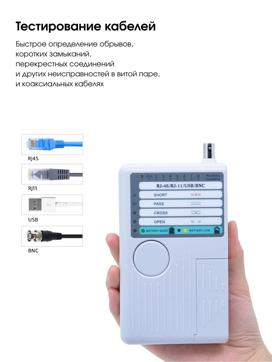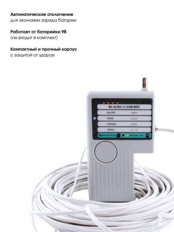 1. Поддерживает интерфейсы RJ-45, RJ-11, BNC и USB A/B, что позволяет тестировать широкий спектр кабелей, включая сетевые, телефонные, коаксиальные и USB.