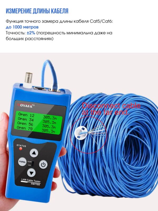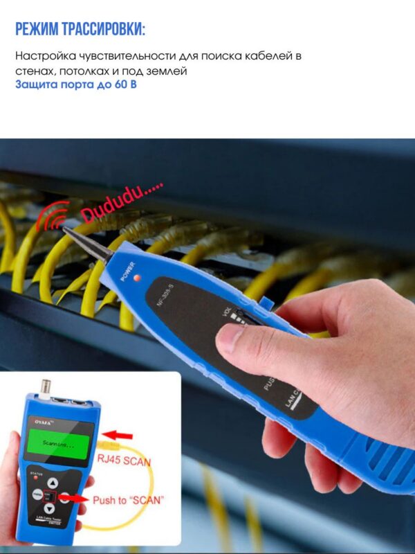 - Отслеживание и проверка 5E, 6E, кабеля сигнализации, коаксиального кабеля, телефонной линии, обрыва цепи, короткого замыкания, перемычки;