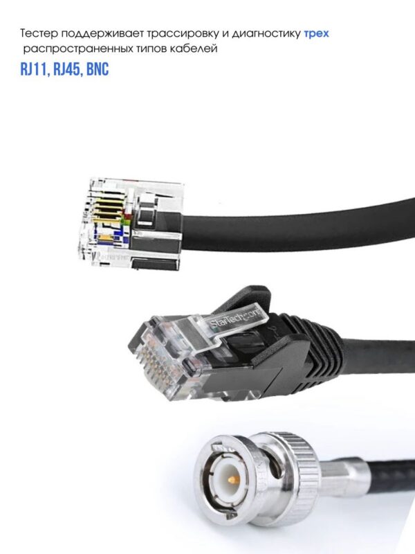 - Типы тестирования кабеля: 5E, 6E, телефонный провод, витой кабель, коаксиальный кабель, USB-кабель и другие кабели;