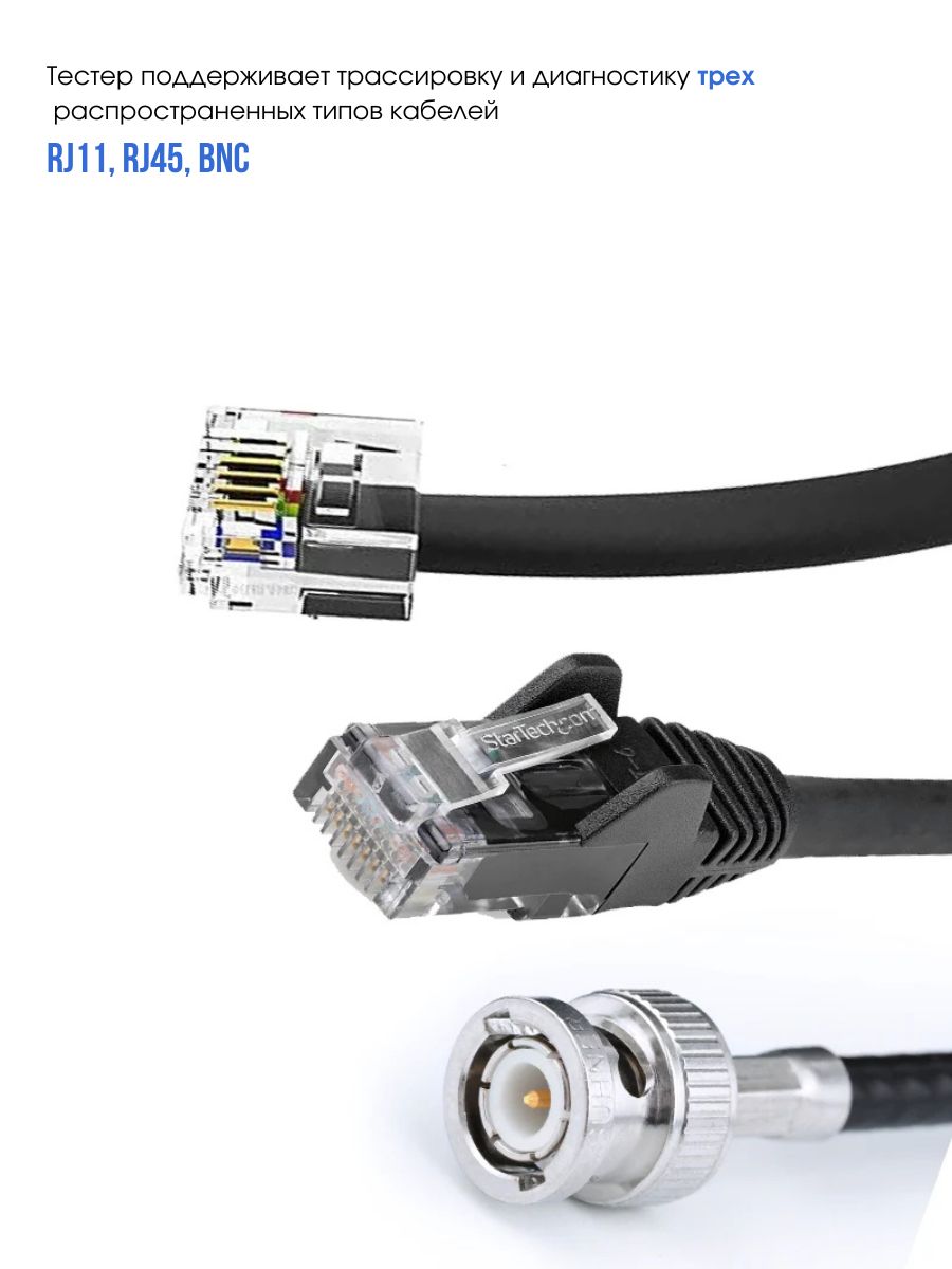 - Отслеживание и проверка 5E, 6E, кабеля сигнализации, коаксиального кабеля, телефонной линии, обрыва цепи, короткого замыкания, перемычки;