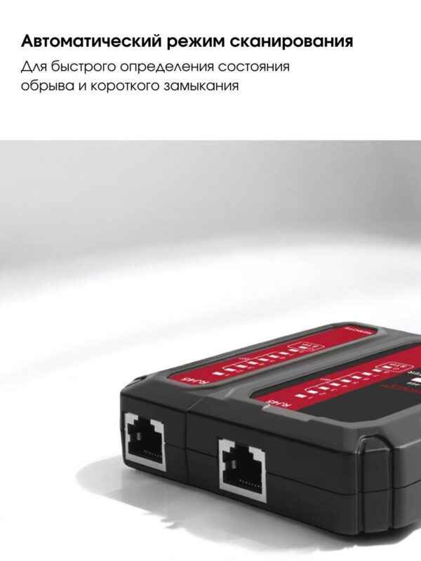 - Автоматически выполняет все тесты и проверяет наличие непрерывных, разомкнутых, закороченных и скрещенных пар проводов.