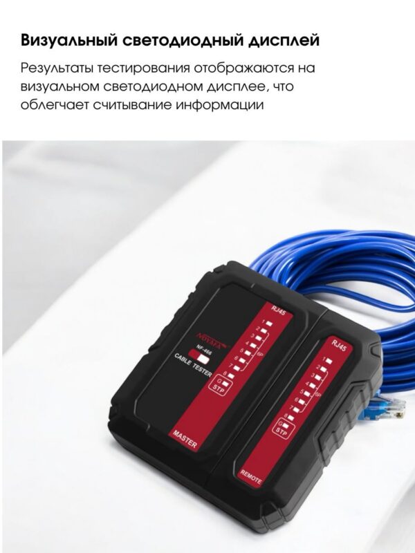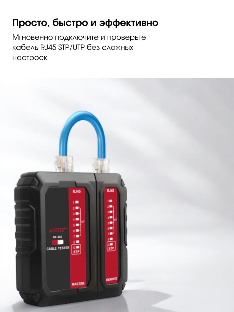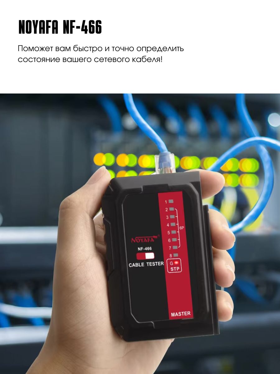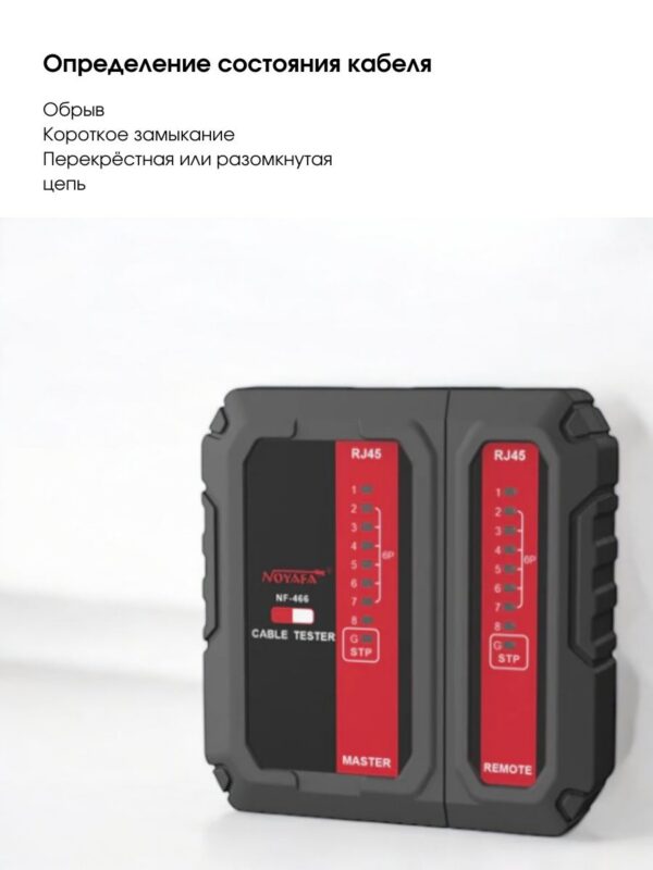 Noyafa NF-466 это многофункциональный кабельный тестер, который объединяет несколько типов тестирования кабеля. Он может проверить состояние кабеля: наличие непрерывных, разомкнутых, закороченных и скрещенных пар проводов для коннекторов RJ45.