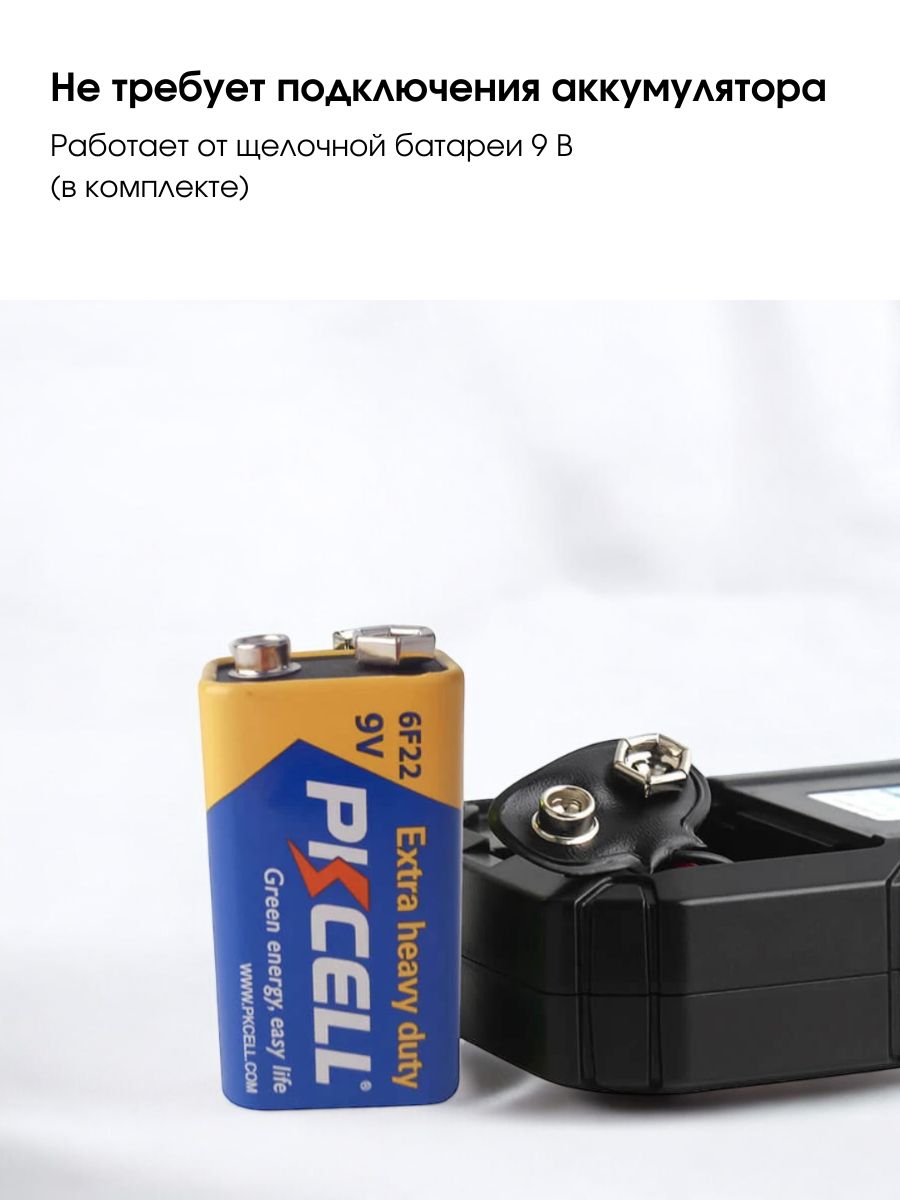 - Питание: батарея — 1 шт. х 9 В тип Крона (в комплект не входит).