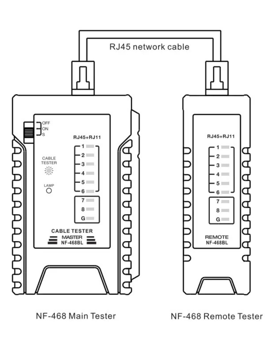 Noyafa NF-468 это многофункциональный кабельный тестер, который объединяет несколько типов тестирования кабеля. Он может проверить состояние кабеля: наличие непрерывных, разомкнутых, закороченных и скрещенных пар проводов для коннекторов RJ45, RJ11 и RJ12.