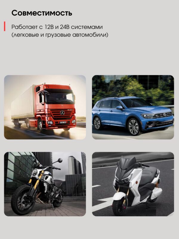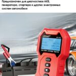 Информация представлена на цифровом экране. Устройство также включает тесты для оценки срока службы батареи, проверки запуска двигателя и анализа работы системы зарядки. Номинальная мощность составляет 0,72 Вт, а пиковая — 16,8 Вт.