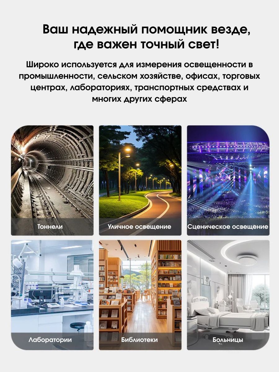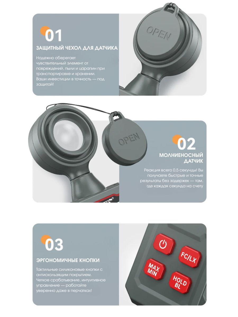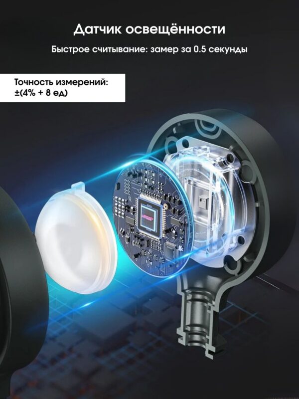 - Чувствительный световой датчик: обеспечивает быстрое считывание с частотой 0,5 секунды, что позволяет оперативно собирать данные. Особенно полезно при измерении уровня освещённости в нескольких местах за короткое время.