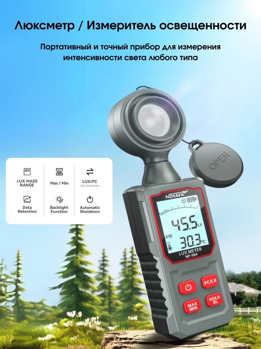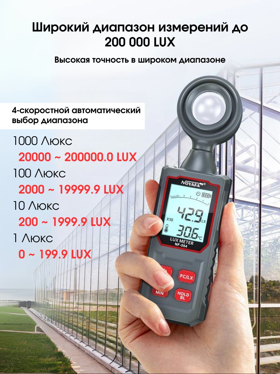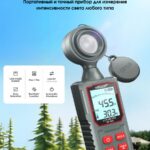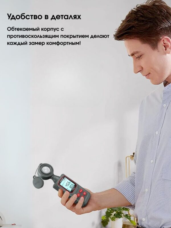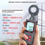 - Высокая точность и широкий диапазон: диапазон измерений до 200 000 LUX и автоматический выбор диапазона с 4 скоростями позволяют использовать прибор в разных условиях. Он одинаково хорошо справляется с измерением слабого света в помещении и яркого солнечного света на улице.
