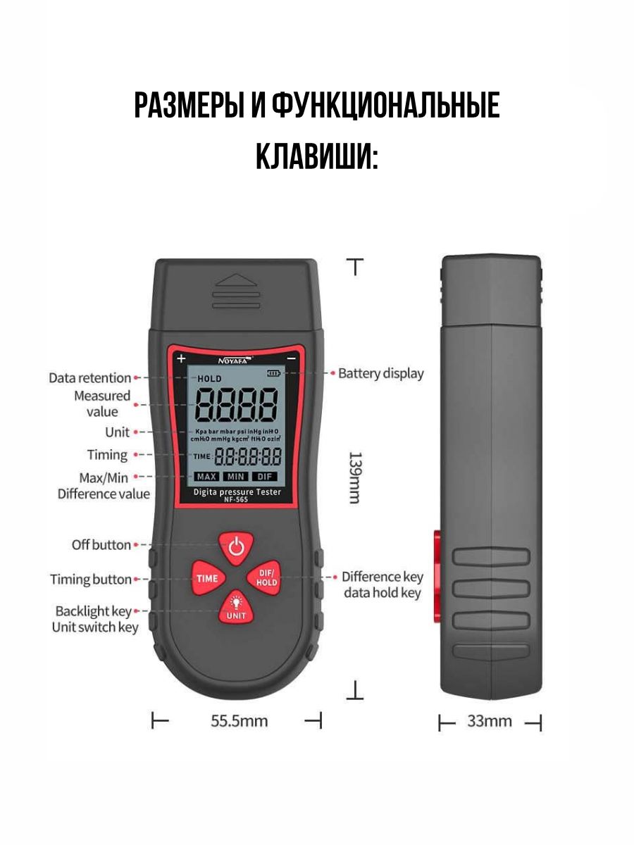 NOYAFA NF-565 Цифровой манометр — это высококачественный измерительный инструмент, который предназначен для точного определения давления в различных системах.