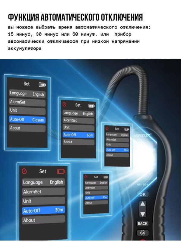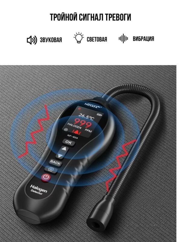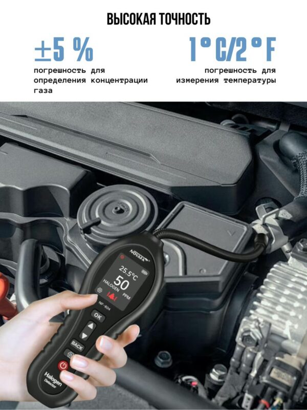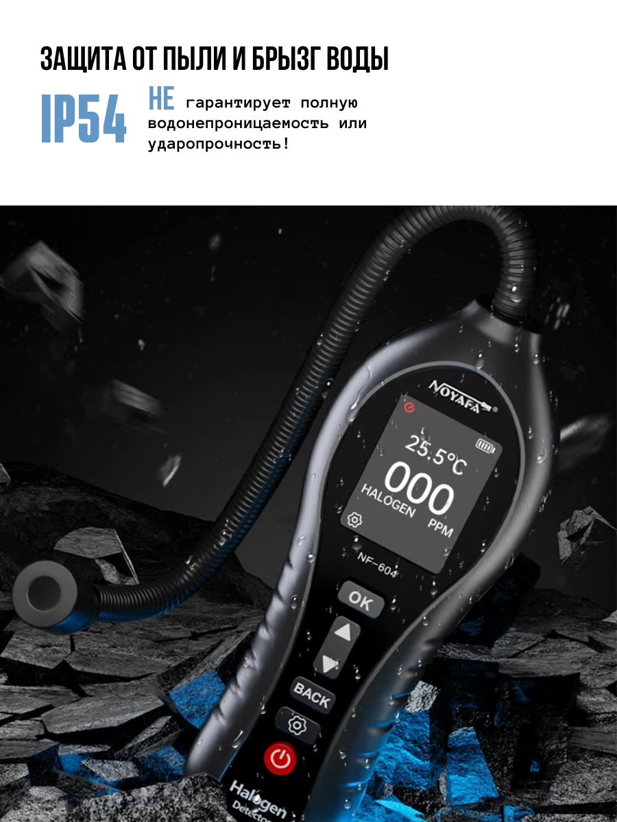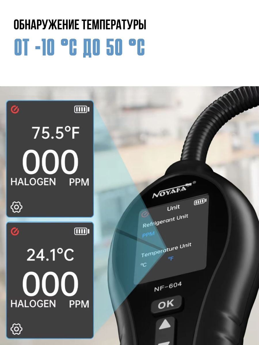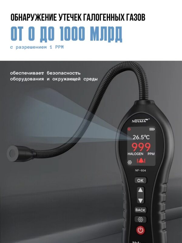 NOYAFA NF-604 – мобильный прибор для быстрого и точного обнаружения утечки галогенного газа. Прибор работает в диапазоне от 0 до 1000 ppm с разрешением 1 ppm, что обеспечивает безопасность вашего оборудования и окружающей среды.