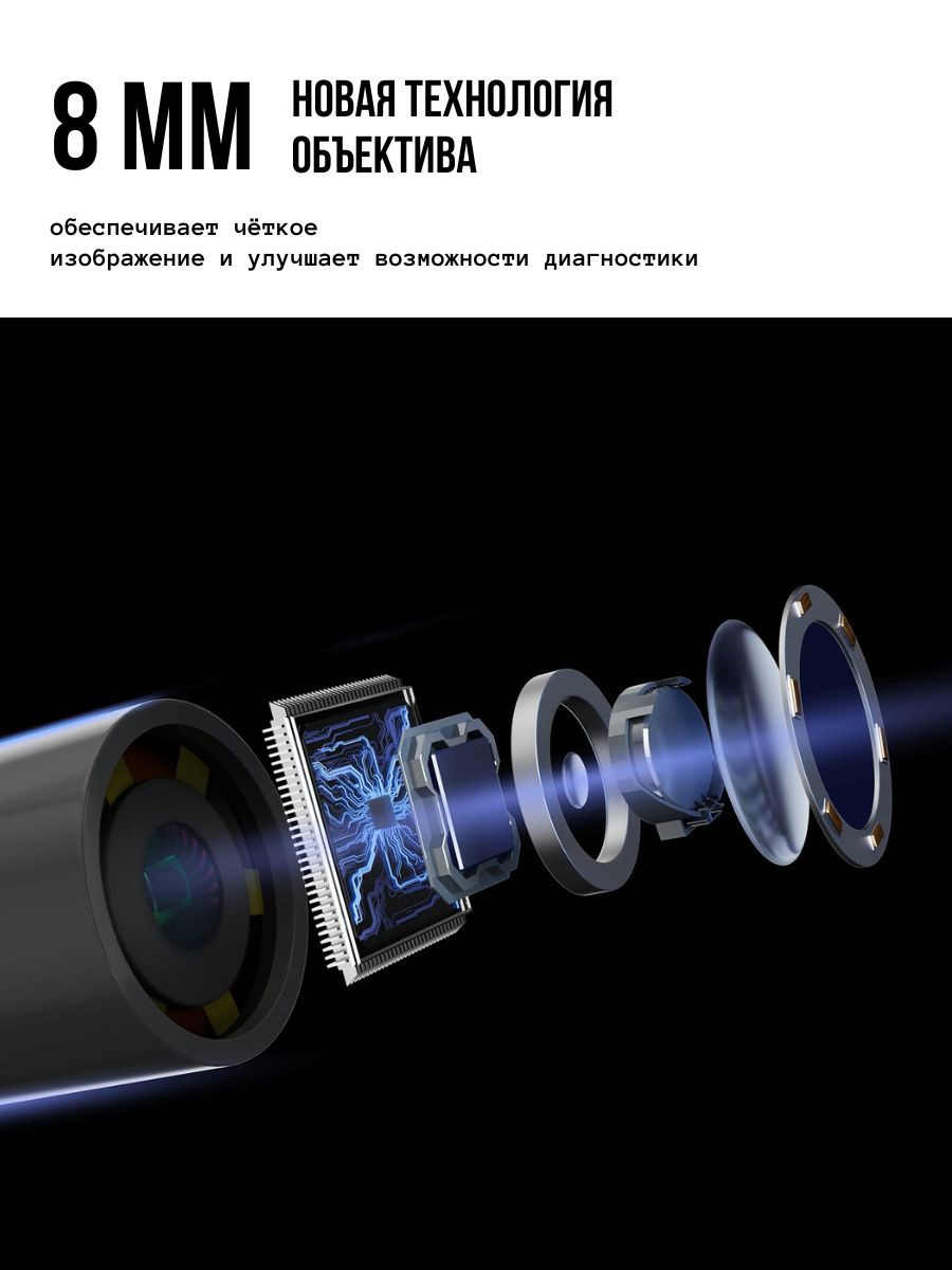- Объектив 8 мм обеспечивает четкое изображение в ограниченном пространстве, улучшая возможности диагностики и осмотра.