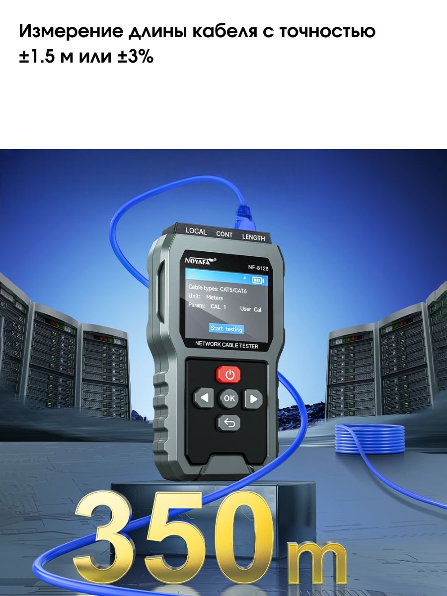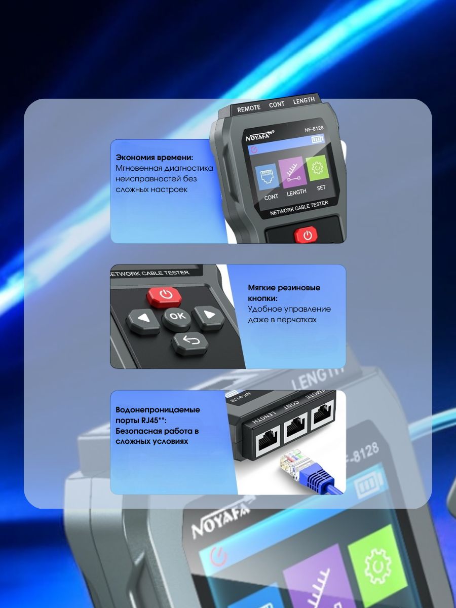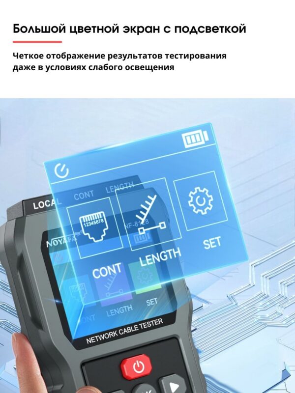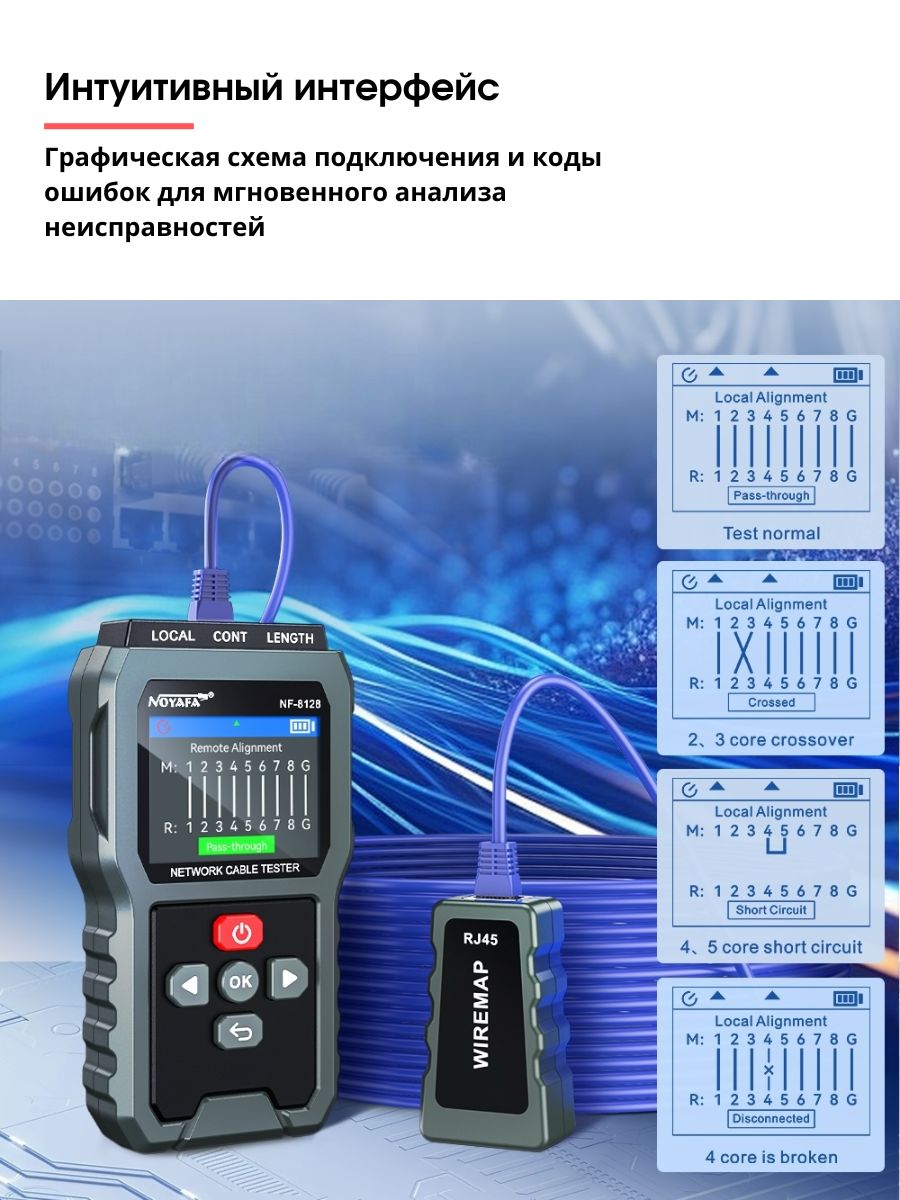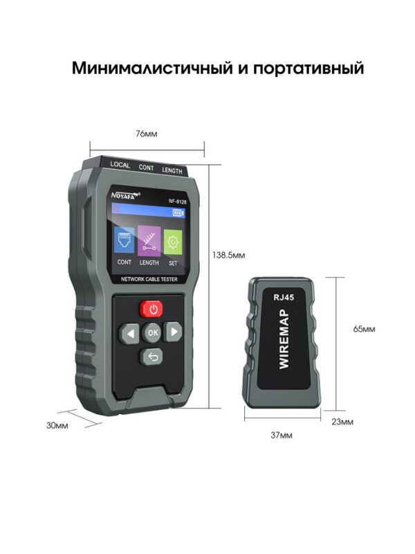 Cетевой кабельный тестер для RJ45 Noyafa NF-8128 — это высококачественное устройство, предназначенное для проверки и диагностики состояния сетевых кабелей. Оно идеально подходит для специалистов, работающих с локальными сетями, а также для установки и обслуживания телефонных и Ethernet-кабелей.