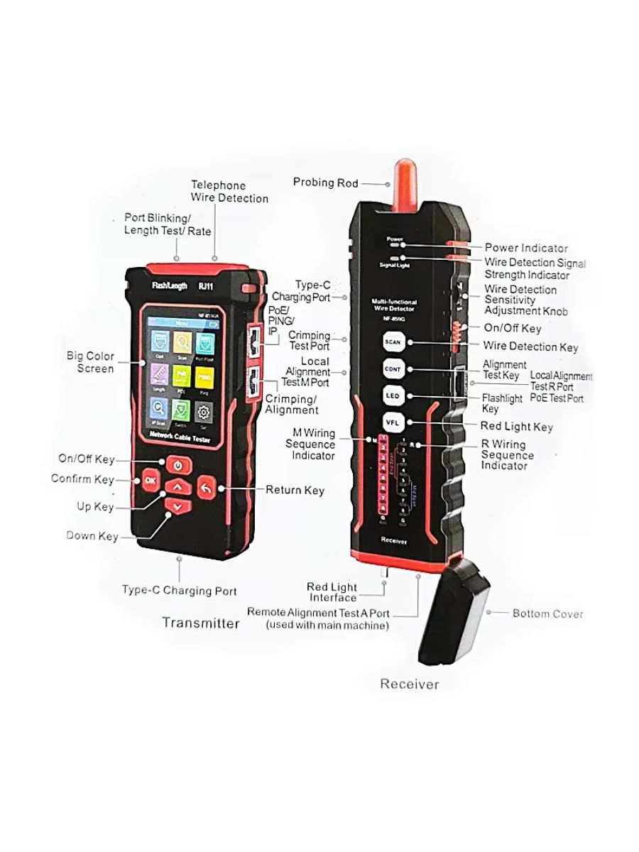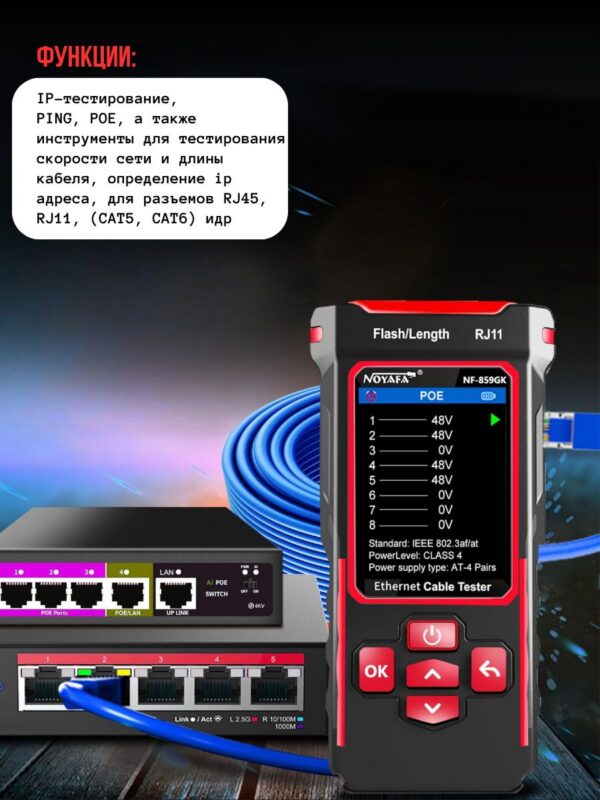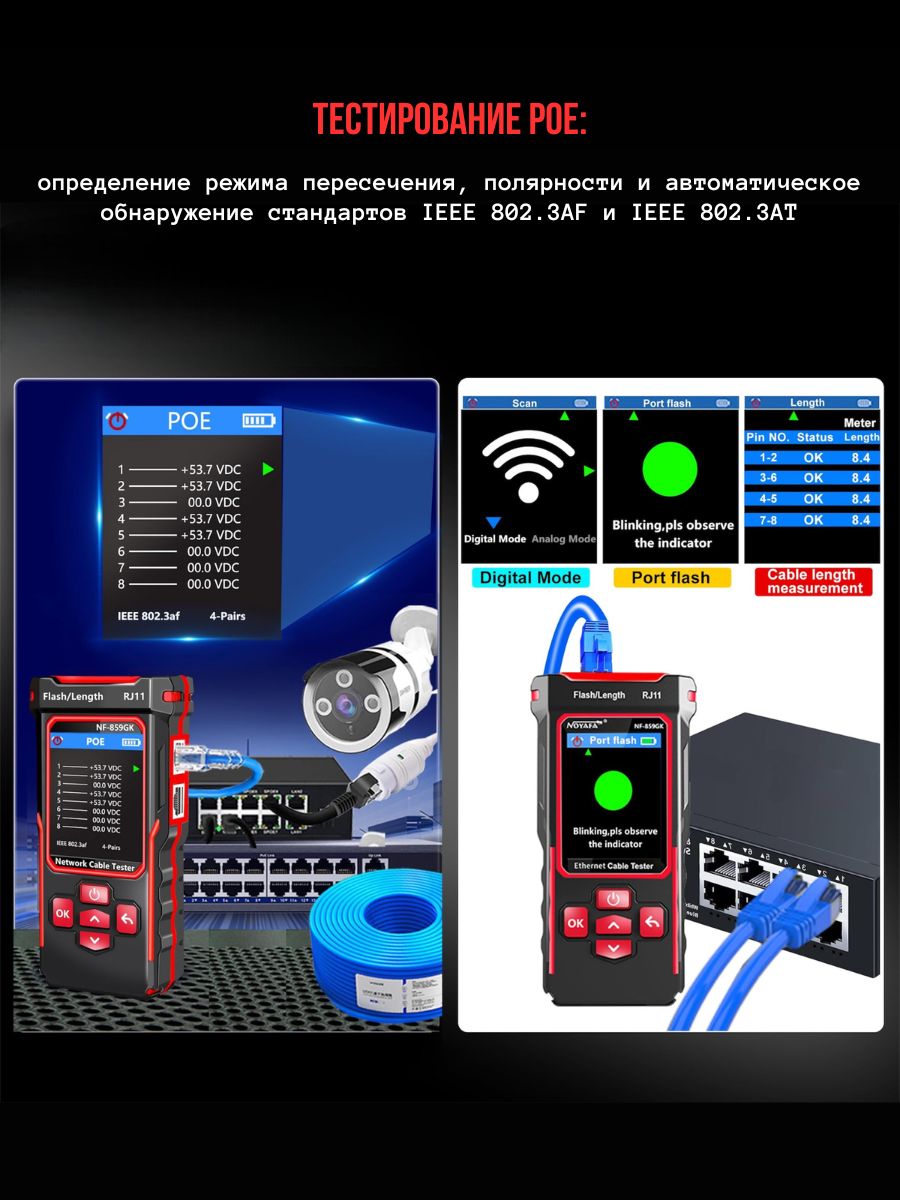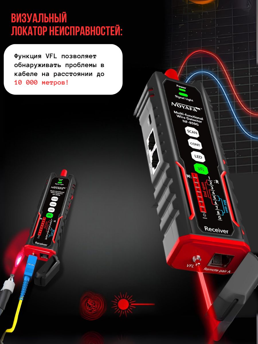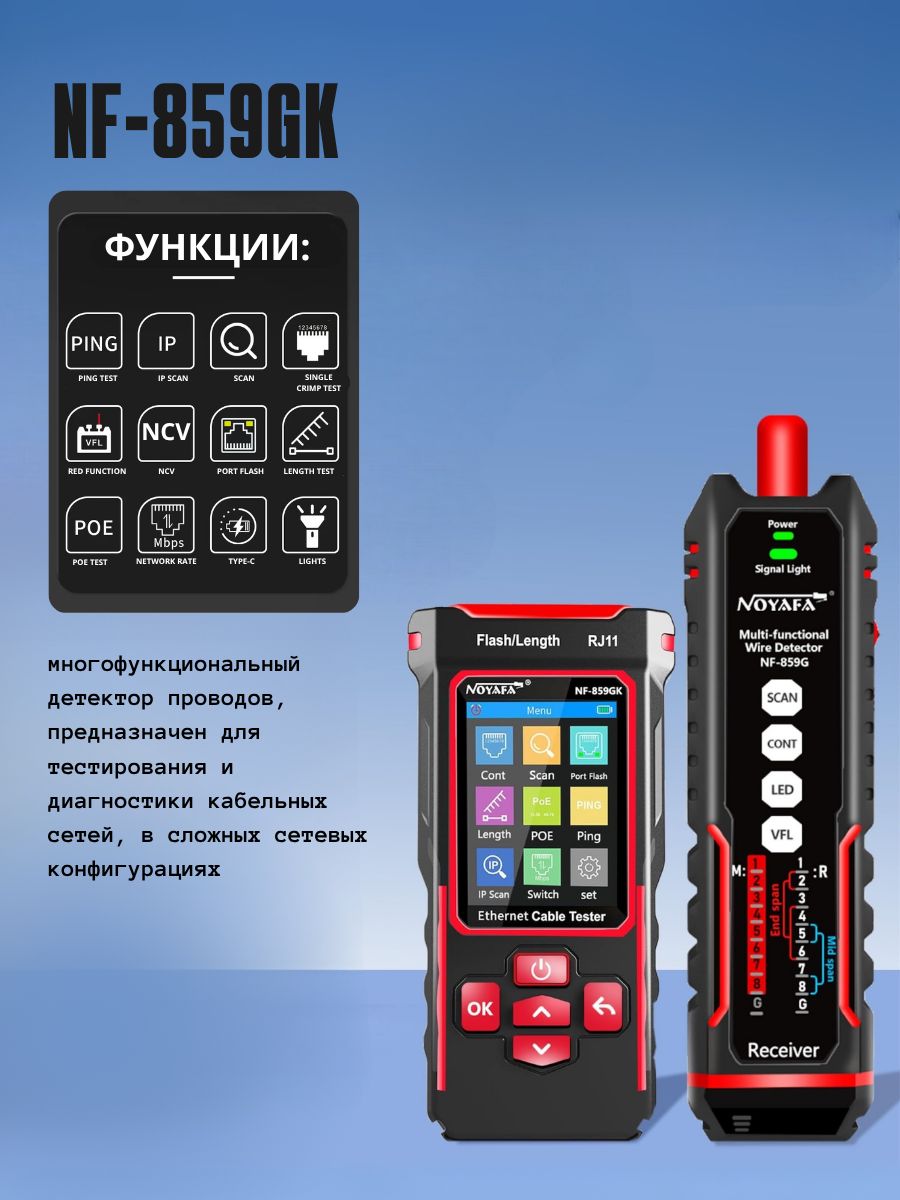 🔵【ТЕСТЕР СЕТЕВОГО КАБЕЛЯ】 NOYAFA NF-859GK — Новый модернизированный многофункциональный сетевой тестер TDR, инструмент для тестирования IP-адресов с функцией сканирования IP-адресов, POE-тест, сетевой кабель с защитой от помех RJ11,RJ45, CAT5, CAT6, тест подключения, проверка скорости подключения к сети Ping, мигание портов, регулировка чувствительности, функциональный тест длины сетевого кабеля. Новое обновление приемника: добавлена функция VFL в приёмник (лазерный дефектоскоп).