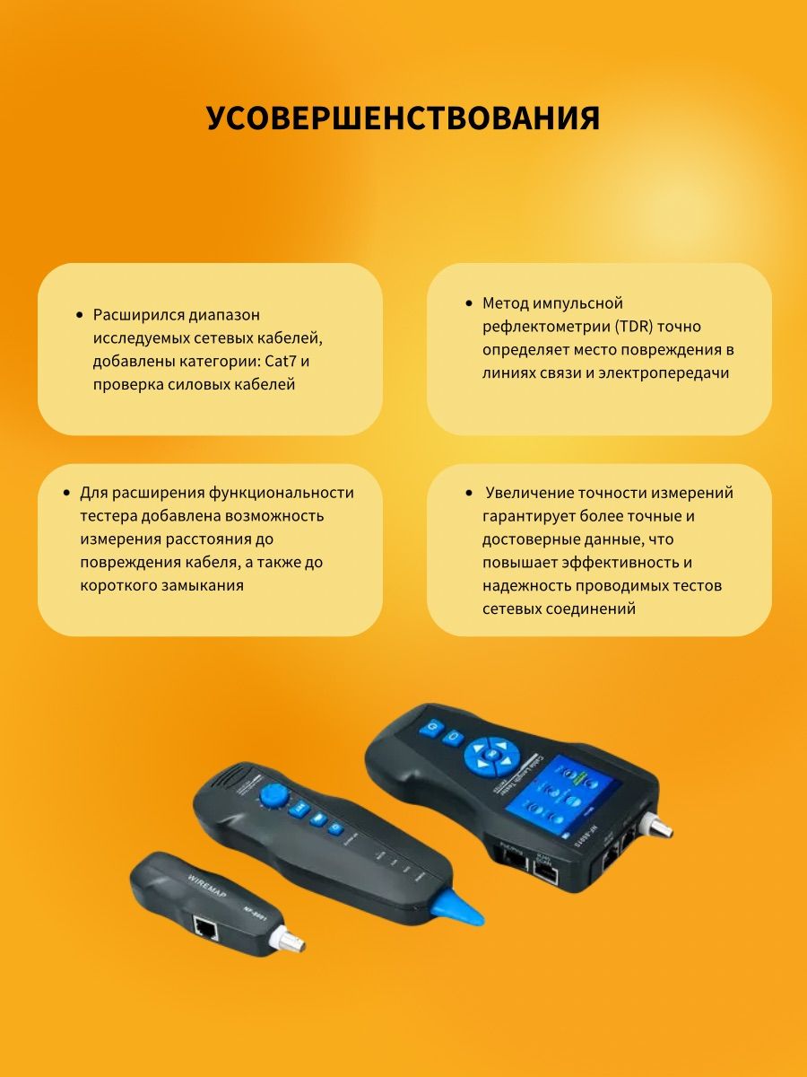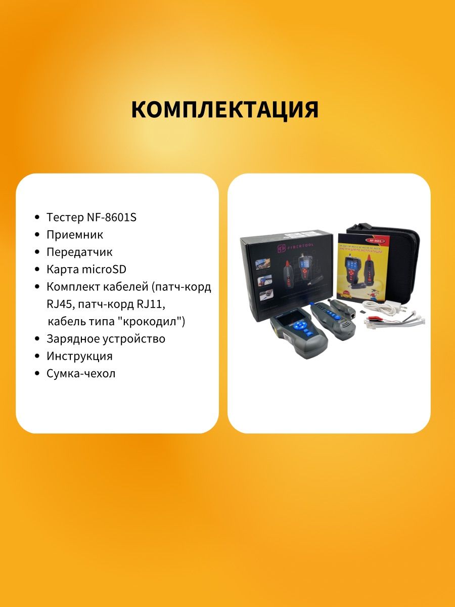 Noyafa-8601S — это улучшенная версия популярного тестера NF-8601. Внешний вид и комплектация прибора остались без изменений в отличии от его функционала. По сравнению с NF-8601 в новой модели реализована более сложная технология анализа (рефлектометр TDR), что позволяет на практике получать более точные и информативные данные. Это основное, но далеко не единственное отличие данных моделей: более подробную информацию вы можете получить в разделе «Ссылки и загрузки».