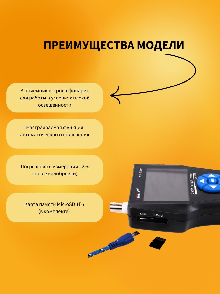 - Измерение длинны сетевого провода, коаксиального кабеля, телефонного провода, а также проводов стандарта USB (без подключения датчика)