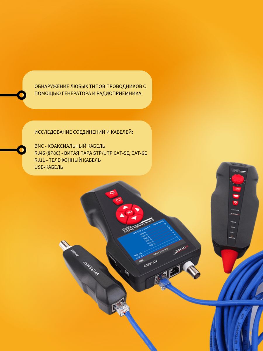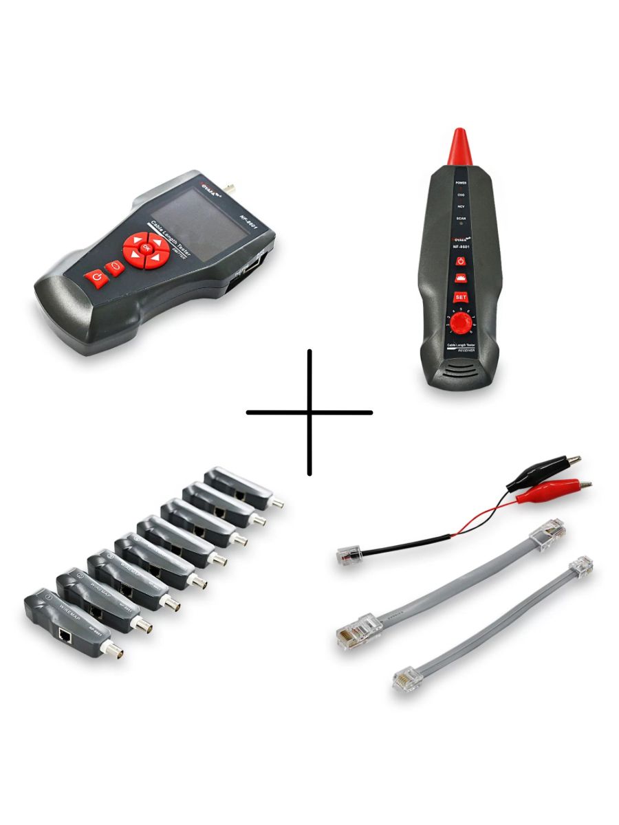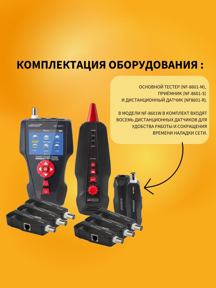 NF-860W -Это многофункциональное устройство, применяемое для измерения длины провода, трассировки линии и поиска обрыва в проводе, PING-тестов, выполнения проверок на наличие POE и напряжения в проводе. Оператор может наблюдать результаты тестирования на цветном дисплее с размером диагонали 3.7 дюйма (94 мм). Все перечисленные возможности делают данный прибор весьма практичным инструментом для персонала, устанавливающего низковольтные системы и обслуживающего коммуникационные линии. Он активно применяется в таких областях, как телефонные системы, компьютерные сети и в других сетях с металлическими проводниками.NF-860W позволяет определять перекрёстные токовые помехи. Комплект оборудования включает три компонента: основной тестер (NF-8601-M), приёмник (NF-8601-S) и дистанционный датчик (NF8601-R). В модели NF-8601W в комплект входят восемь дистанционных датчиков для удобства работы и сокращения времени наладки сети.