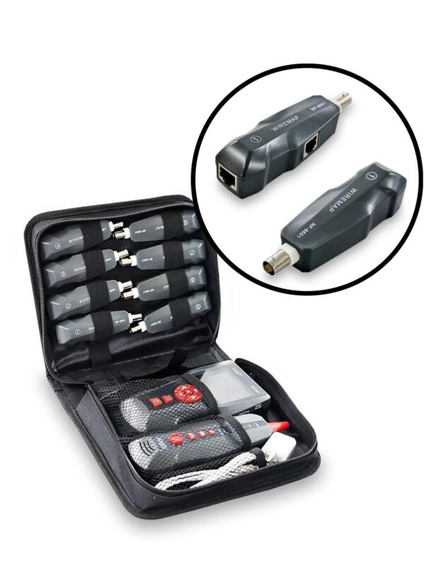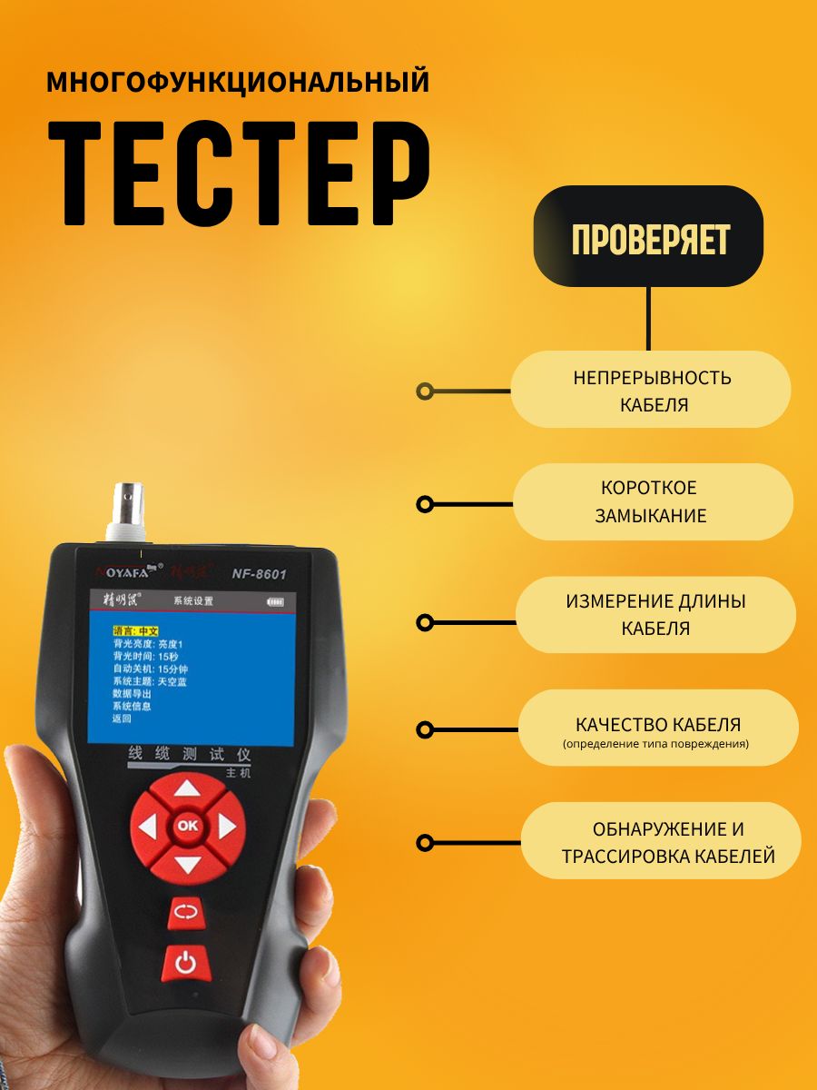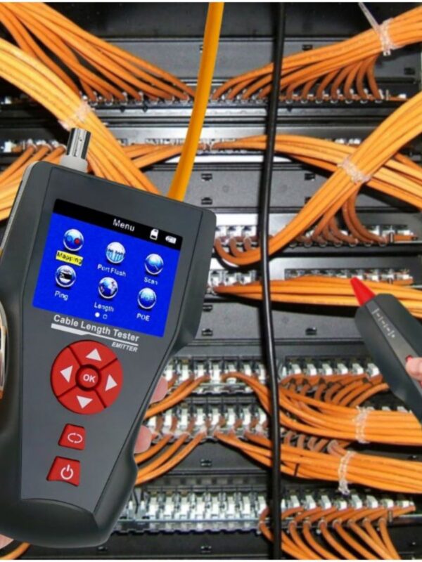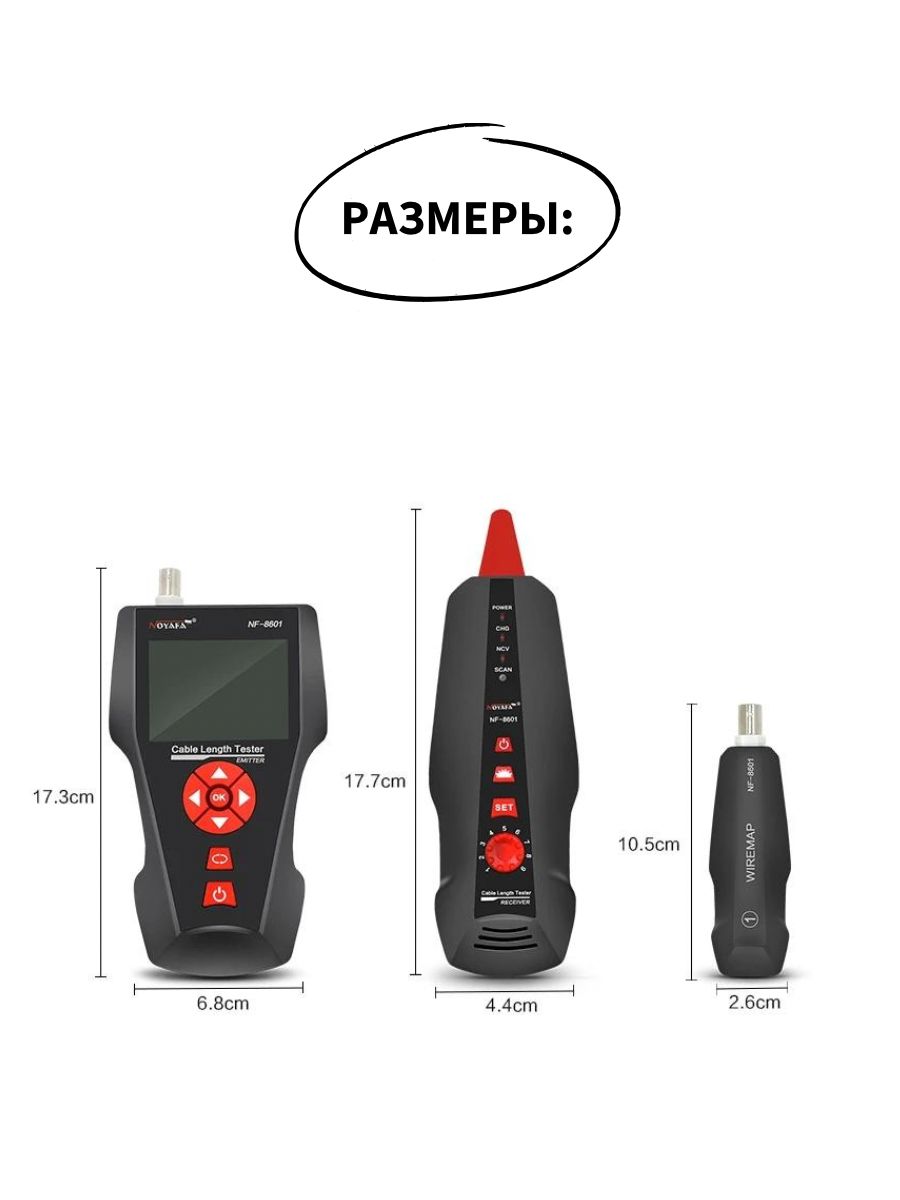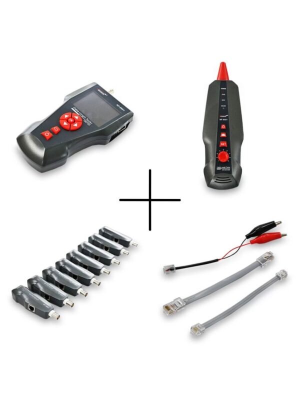 NF-860W -Это многофункциональное устройство, применяемое для измерения длины провода, трассировки линии и поиска обрыва в проводе, PING-тестов, выполнения проверок на наличие POE и напряжения в проводе. Оператор может наблюдать результаты тестирования на цветном дисплее с размером диагонали 3.7 дюйма (94 мм). Все перечисленные возможности делают данный прибор весьма практичным инструментом для персонала, устанавливающего низковольтные системы и обслуживающего коммуникационные линии. Он активно применяется в таких областях, как телефонные системы, компьютерные сети и в других сетях с металлическими проводниками.NF-860W позволяет определять перекрёстные токовые помехи. Комплект оборудования включает три компонента: основной тестер (NF-8601-M), приёмник (NF-8601-S) и дистанционный датчик (NF8601-R). В модели NF-8601W в комплект входят восемь дистанционных датчиков для удобства работы и сокращения времени наладки сети.