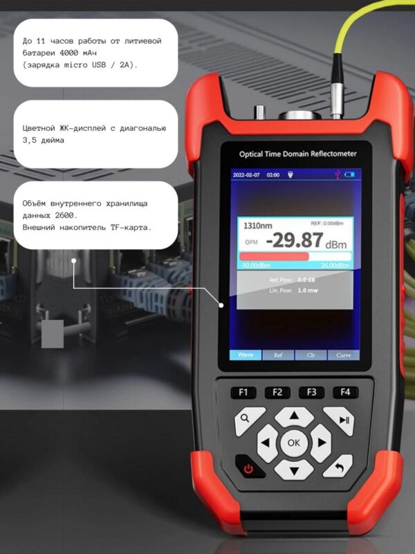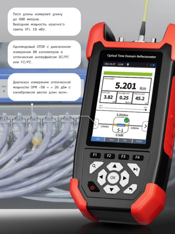 ОСОБЕННОСТИ — OTDR — одиночный режим OTDR 22/20 дБ, диапазон испытаний 80 километров, SC/PC или оптический интерфейс FC/PC