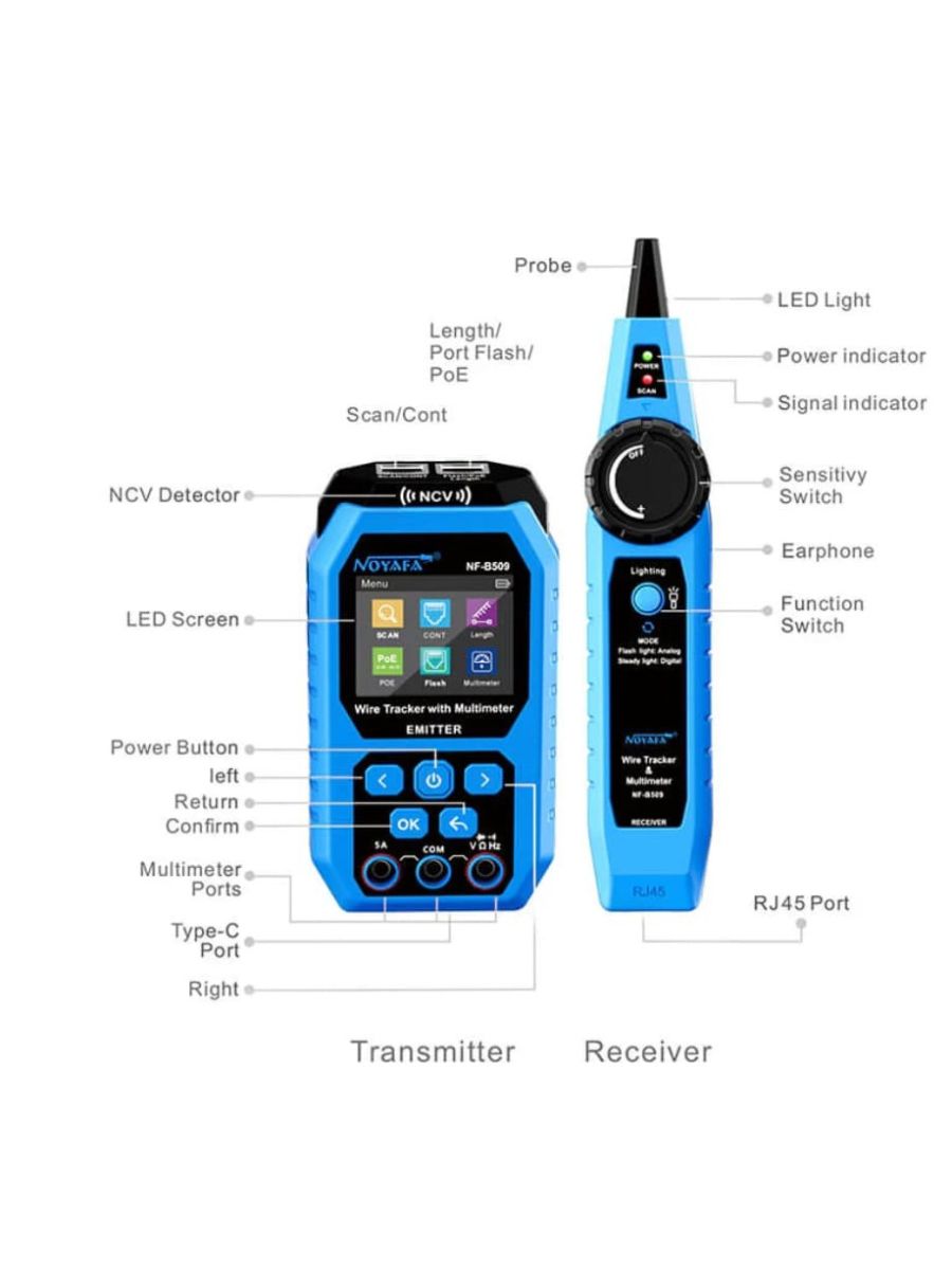 В Noyafa NF-B509 используются самые современные функции для точной идентификации кабелей и прослеживания их прохождения через стены, потолки и полы, что позволяет вам без особых усилий определить их точное местоположение.