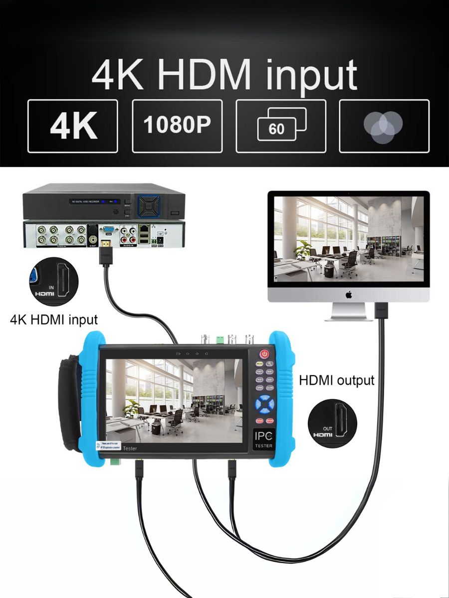 - Поддержка разных камер. Устройство поможет провести проверку или настройку камер AHD, CVI, TVI, IP с разрешением до 8 Мп. Это устройство совместимо с разными моделями камер, что делает его универсальным монитором-тестером.